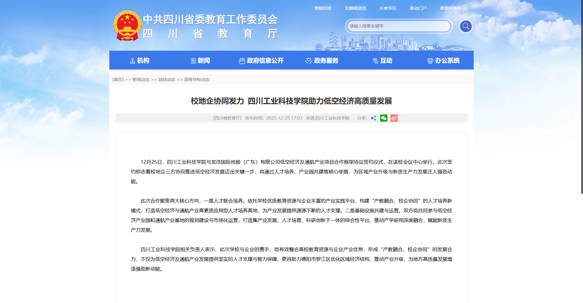 四川工业科技学院相关负责人表示,此次学校与企业的携手,将有效整合高校教育资源与企业产业优势,形成“产教融合、校企协同”的发展合力,不仅为低空经济及通航产业发展提供坚实的人才支撑与智力保障,更将助力德阳市罗江区优化区域经济结构、推动产业升级,为地方高质量发展增添强劲新动能。