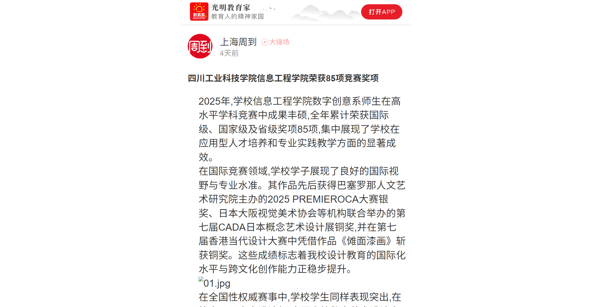 2025年,学校信息工程学院数字创意系师生在高水平学科竞赛中成果丰硕,全年累计荣获国际级、国家级及省级奖项85项,集中展现了学校在应用型人才培养和专业实践教学方面的显著成效。