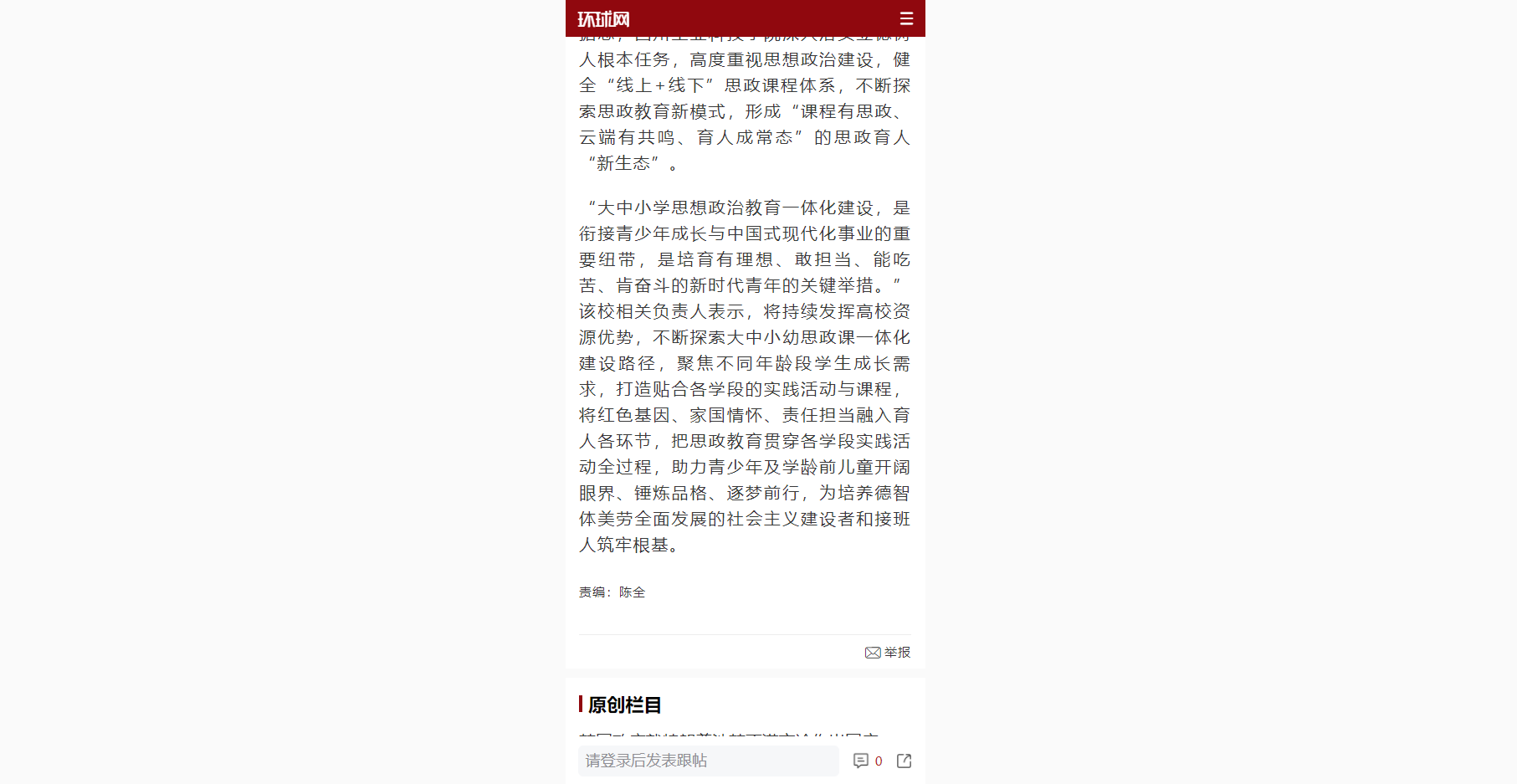 “大中小学思想政治教育一体化建设,是衔接青少年成长与中国式现代化事业的重要纽带,是培育有理想、敢担当、能吃苦、肯奋斗的新时代青年的关键举措。”该校相关负责人表示,将持续发挥高校资源优势,不断探索大中小幼思政课一体化建设路径,聚焦不同年龄段学生成长需求,打造贴合各学段的实践活动与课程,将红色基因、家国情怀、责任担当融入育人各环节,把思政教育贯穿各学段实践活动全过程,助力青少年及学龄前儿童开阔眼界、锤炼品格、逐梦前行,为培养德智体美劳全面发展的社会主义建设者和接班人筑牢根基。
