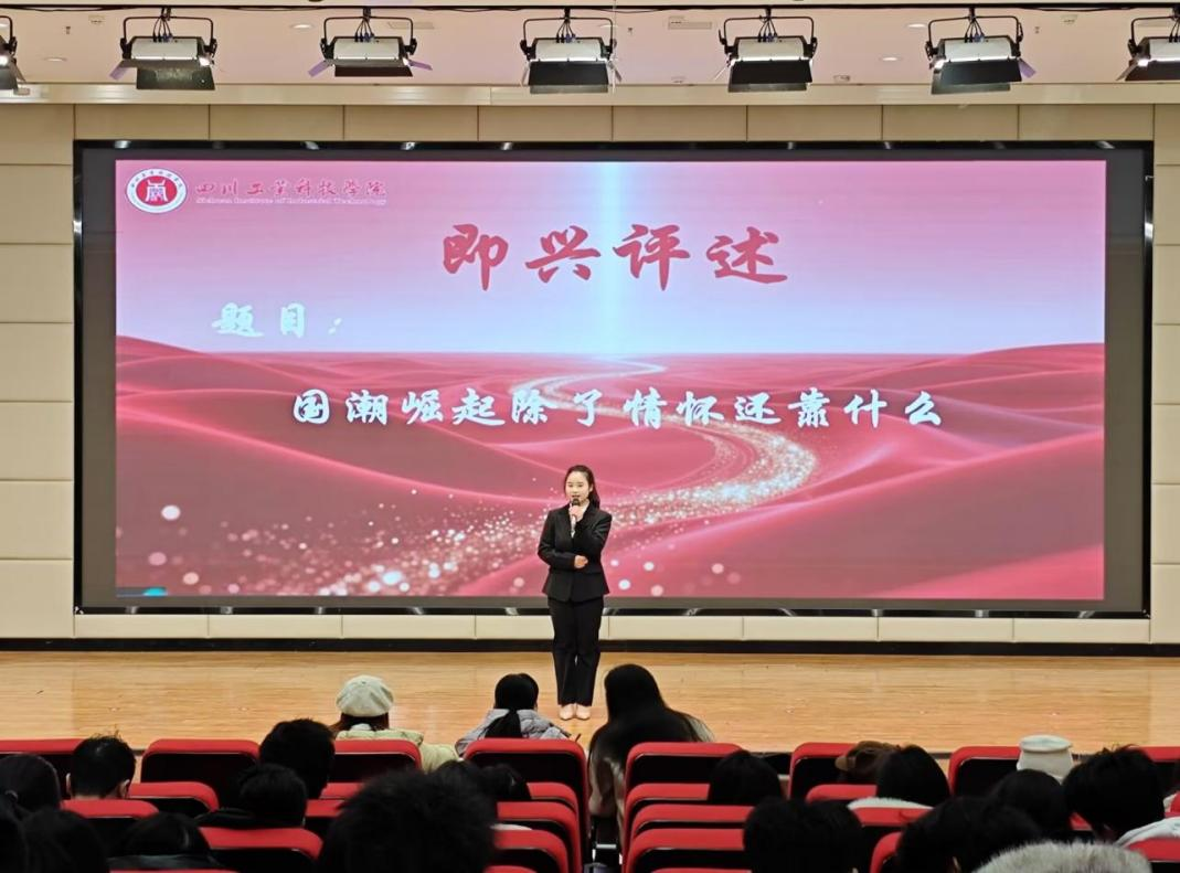即兴评述环节对选手的临场应变与逻辑思维提出了更高要求。选手需在90秒内,对随机抽取的社会热点话题进行即兴分析与阐述。题目涵盖“国潮崛起除情怀外还依靠什么”“‘脆皮年轻人’是‘自嘲’还是‘真相’”“数字游民的生活是自由还是另一种漂泊”等多个维度,兼具时代性与思辨性。面对挑战,选手们沉着应对、快速构思,以清晰的条理和独到的见解完成了评述,展现出良好的综合素质。