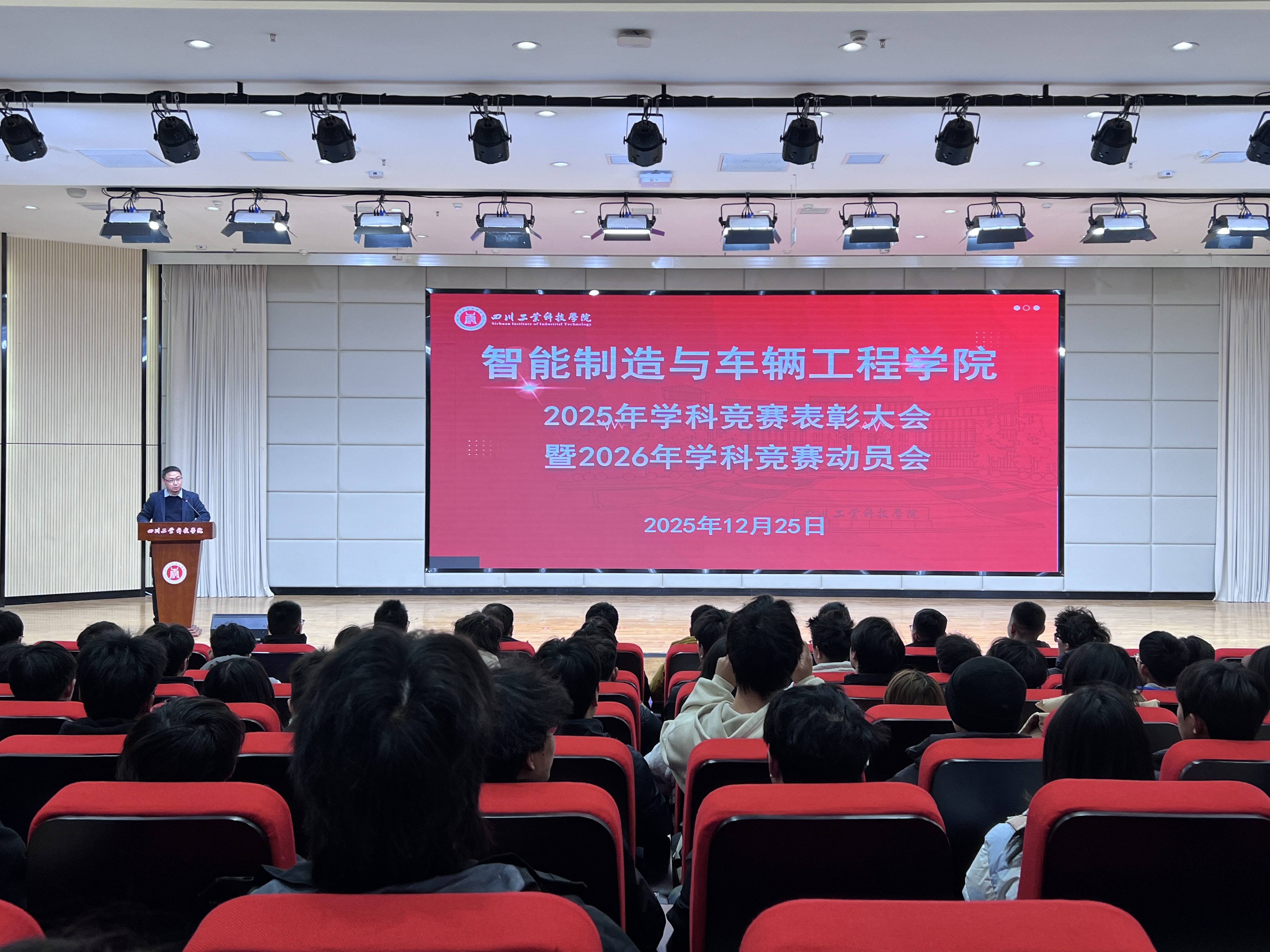 12月25日下午,智能制造与车辆工程学院在龑江C区报告厅举行2025年度学科竞赛表彰大会暨2026年动员会。学院院长袁新、部分行政人员、教师代表及获奖学生参加会议。会议由教学办副主任刘家麟主持。