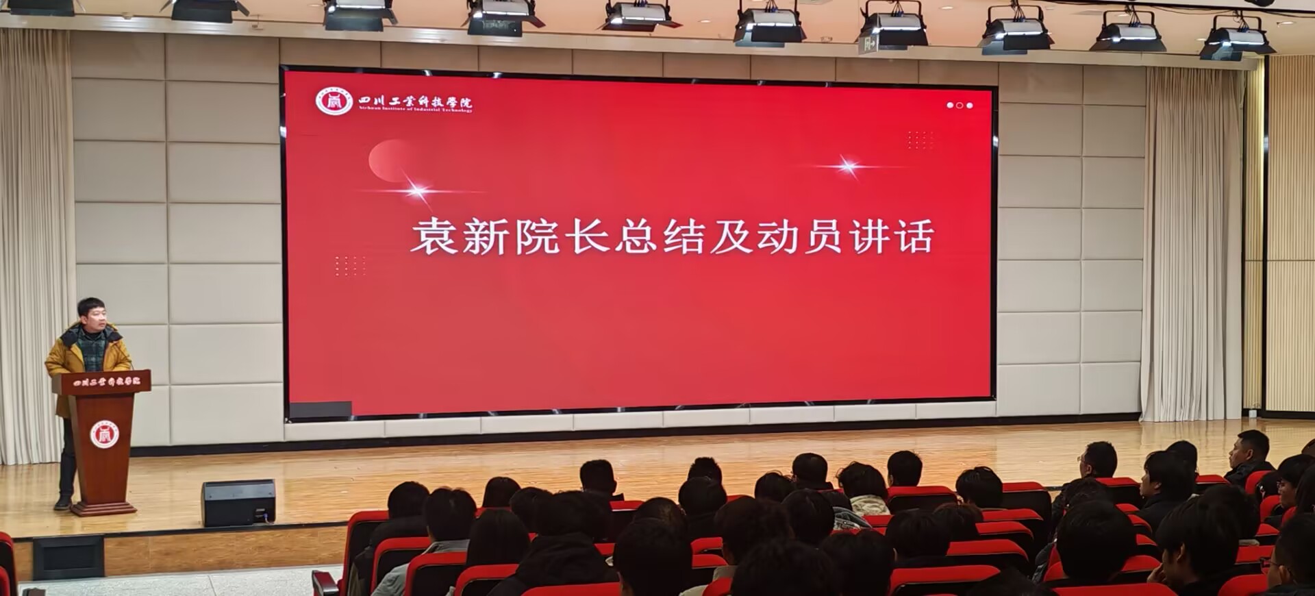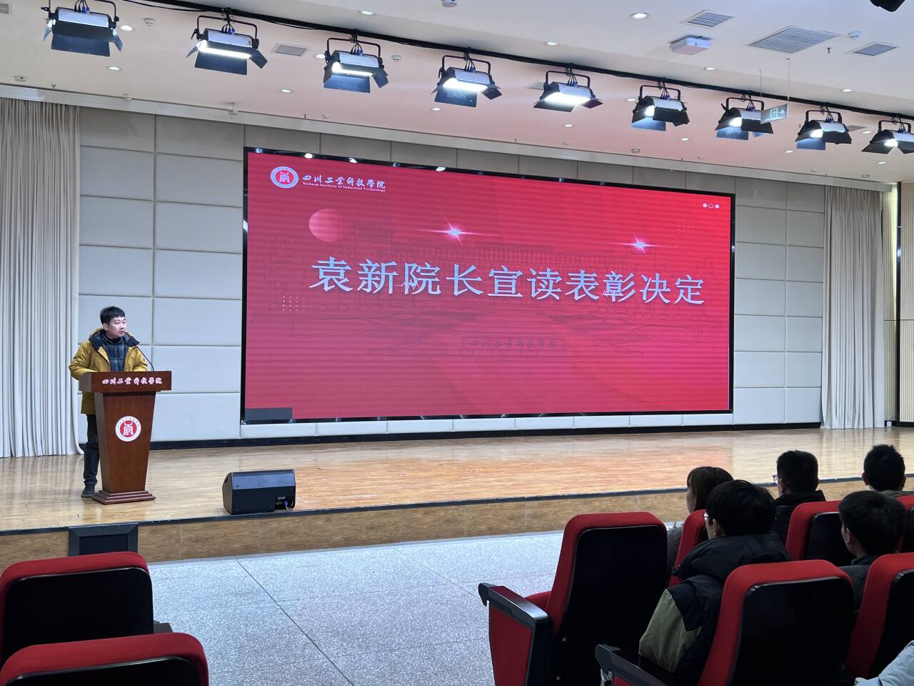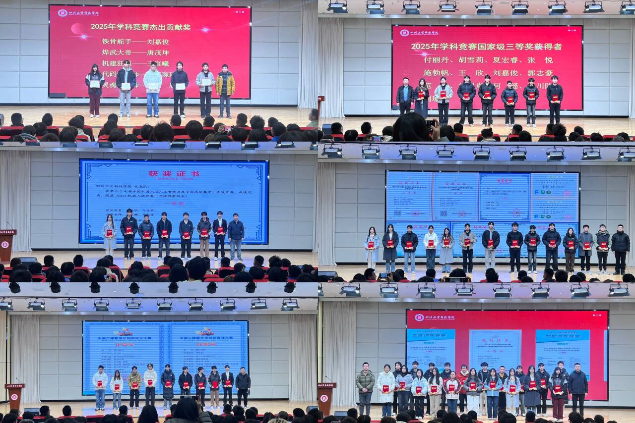 随后,袁新宣读了《关于表彰2025年参加各类学科竞赛获奖学生的决定》。2025年在全院师生的共同努力下,学院共获得各级各类学科竞赛奖项90项。其中,国家级奖项17项,包括全国一等奖3项、全国二等奖5项、全国三等奖8项、全国优秀奖1项;省级及西部赛区奖项73项,涵盖四川省特等奖2项、四川省一等奖18项、四川省三等奖49项、西部赛区二等奖1项、西部赛区三等奖2项、西部赛区优胜奖1项。特别是在中国机器人及人工智能大赛、全国三维数字化创新设计大赛、全国大学生智能汽车竞赛等重要赛事中,学院学子展现出扎实的专业功底和卓越的创新能力。