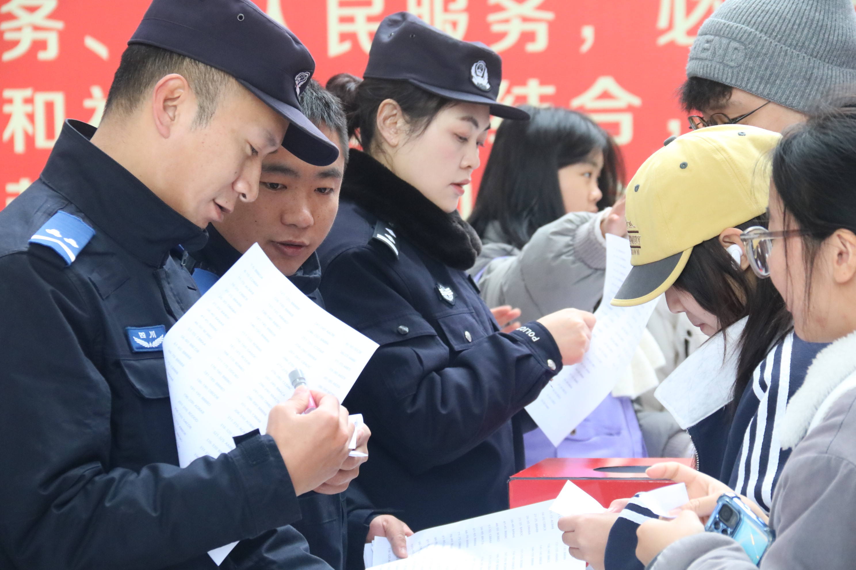 活动现场,学生在志愿者引导下有序扫码领题、参与答题。试题聚焦公安职责、便民服务、安全防范等实用知识点,志愿者全程协助维持秩序、答疑解惑,配合民警讲解安全要点,并负责核对答题正确率、加盖印章及引导礼品兑换,服务细致高效。此次活动既加深了学生对公安工作的认知,提升了安全防护能力,也通过志愿服务锤炼了学生的责任担当,为平安校园建设夯实基础。