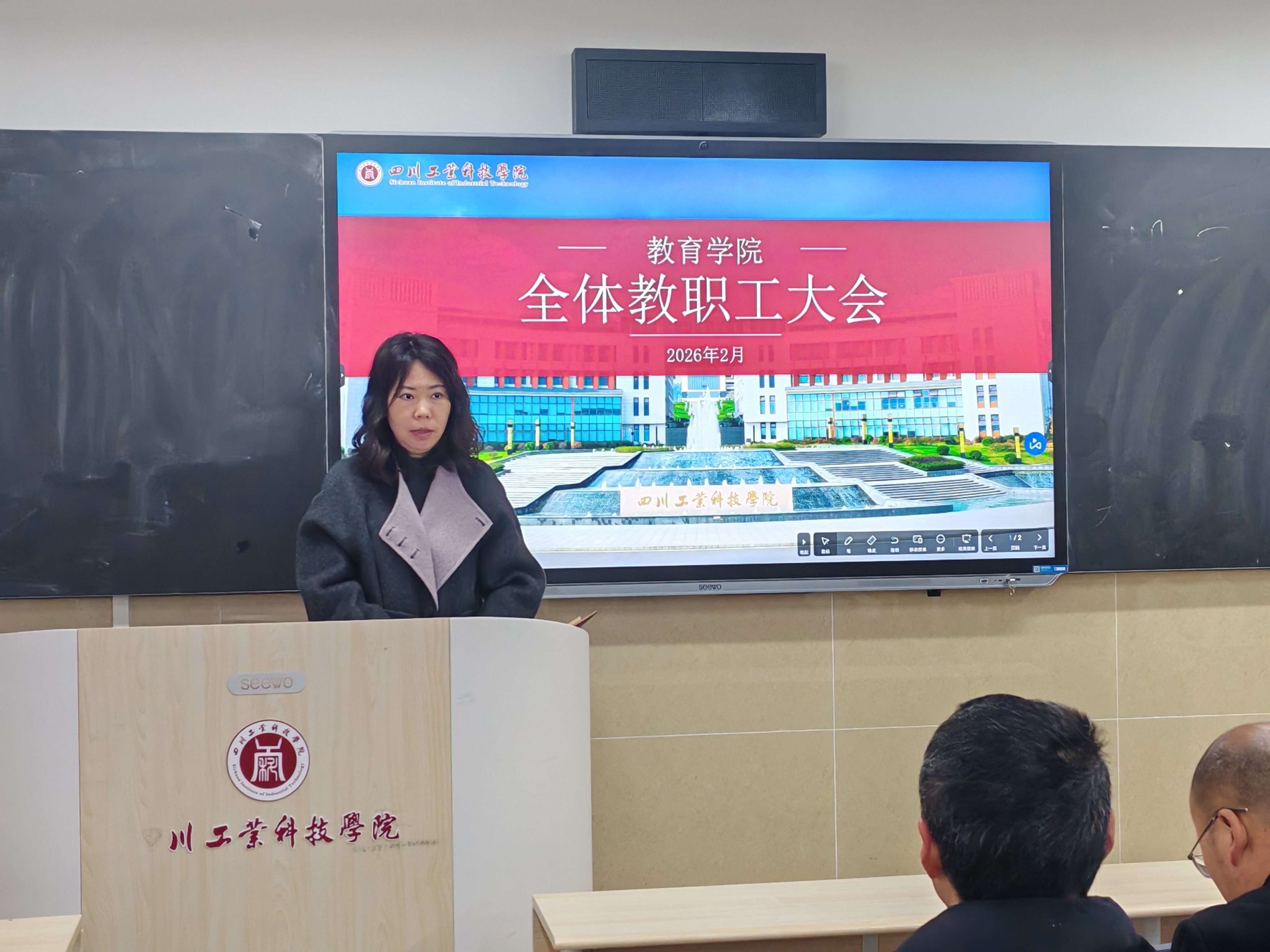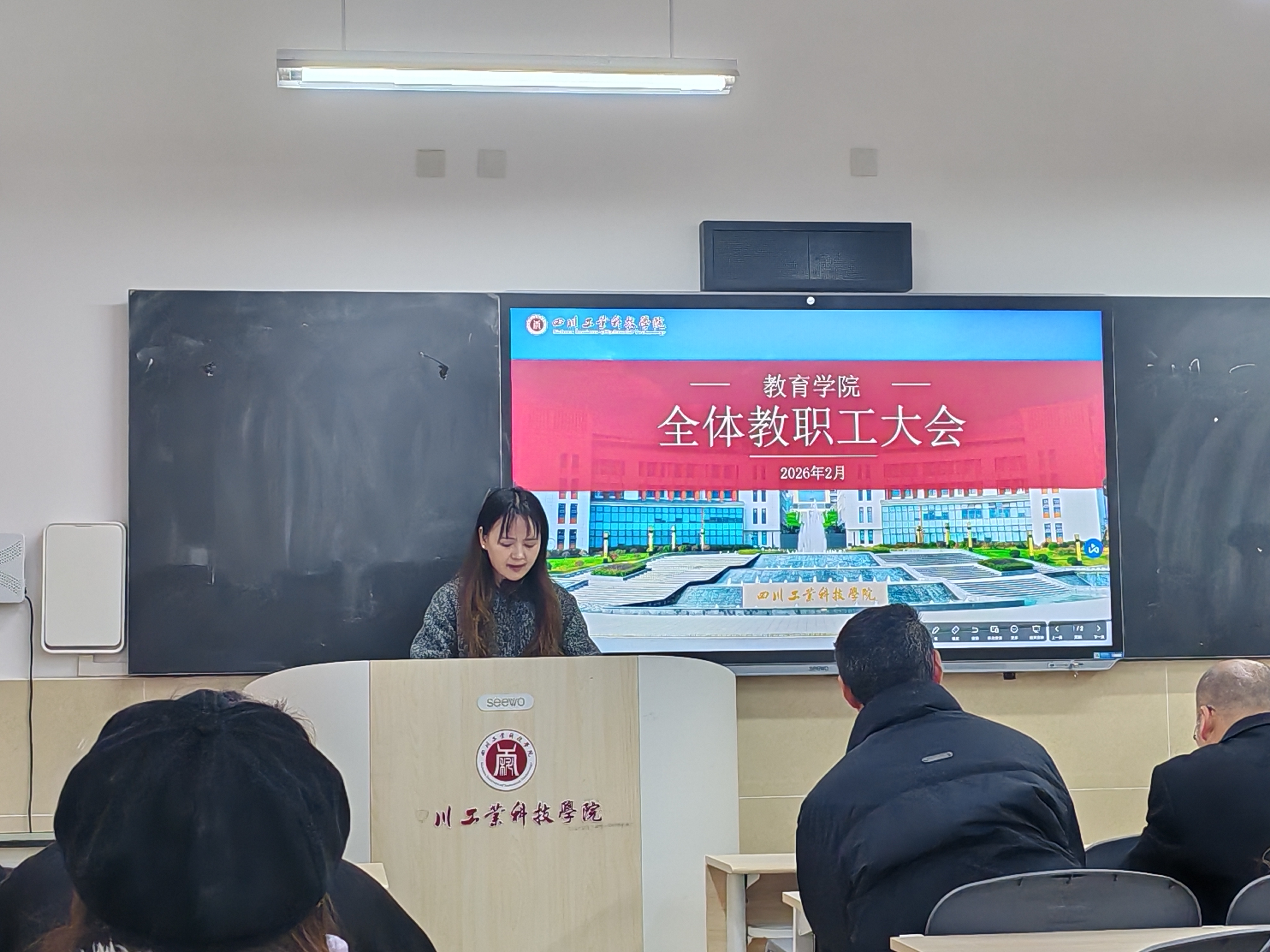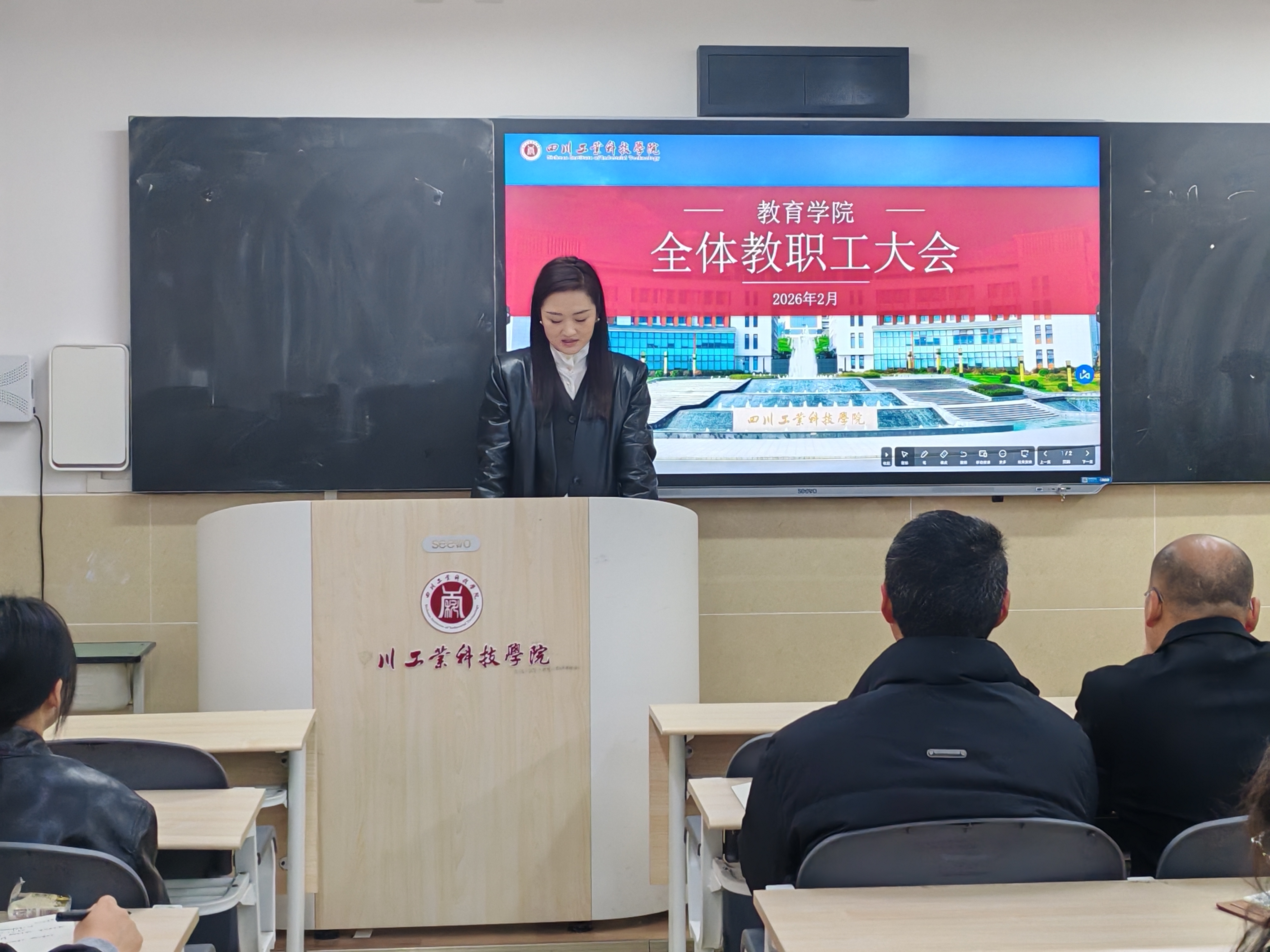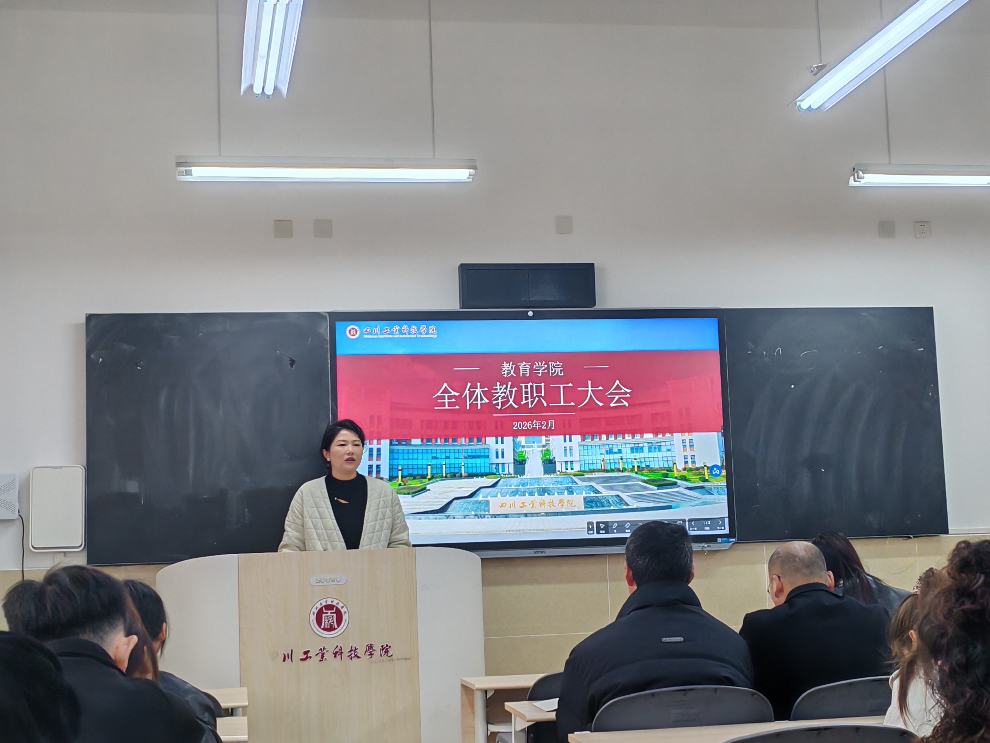 2月27日上午,教育学院在龑江召开新学期全体教职工大会。学院全体教职工参加会议,会议由学院综合办副主任周洪婷主持。
