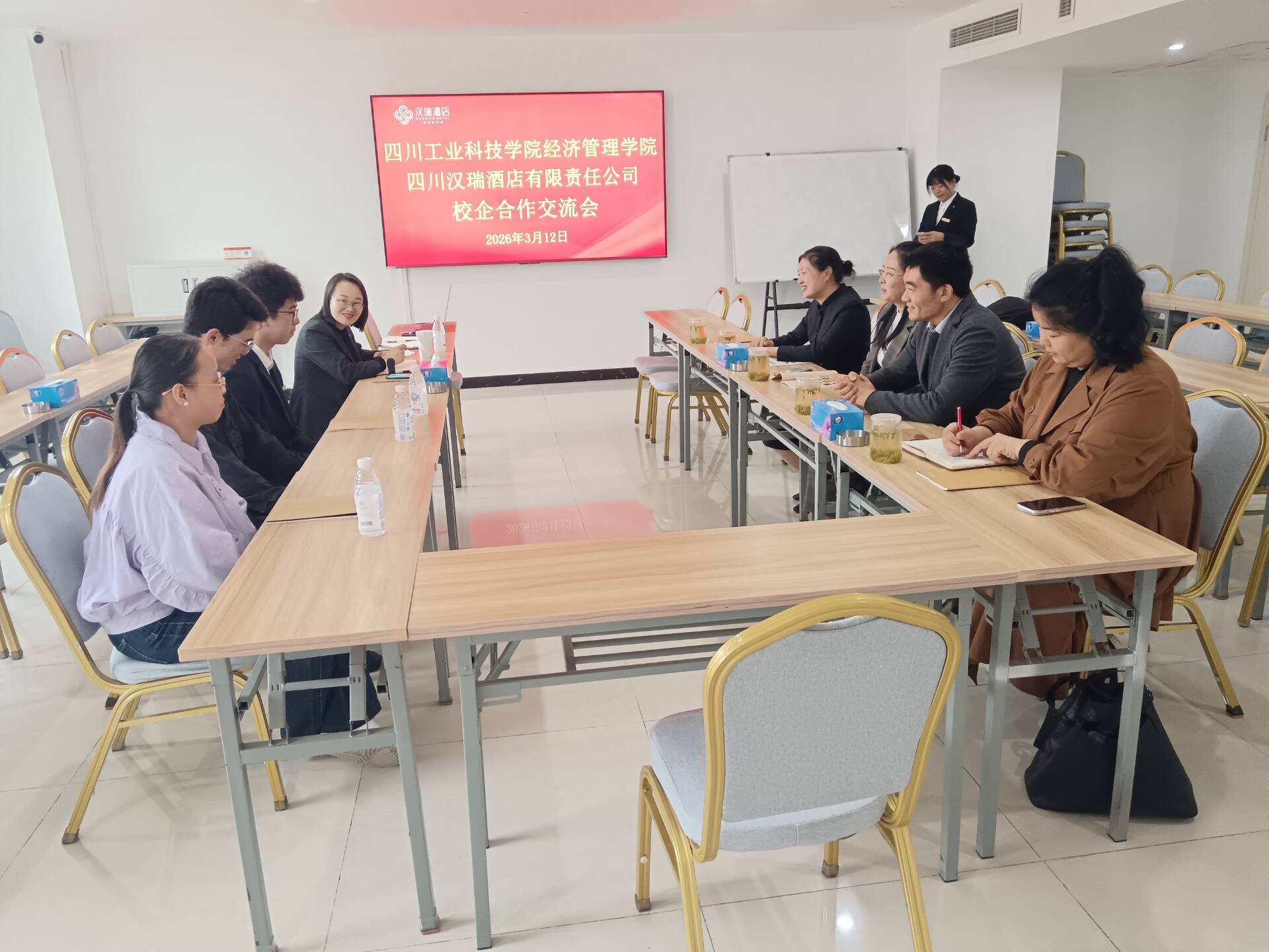 3月12日下午,学校经济管理学院党总支副书记马娟花、副院长王波率队前往四川汉瑞酒店有限公司开展实地走访与交流工作。学院实训室主任张鑫鑫、就业干事仝科、专业课教师张勇随同参加。
