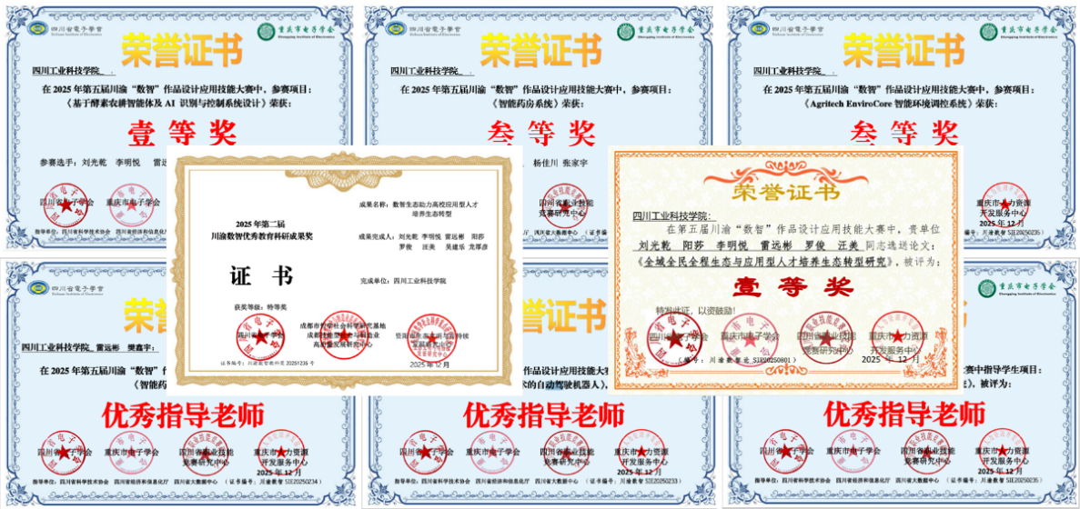 近日,2025年第五届川渝“数智”作品设计应用技能大赛结果揭晓。学校师生团队在本届赛事中表现优异,共荣获特等奖、一等奖、三等奖等多个奖项,六位教师获评“优秀指导老师”。参赛作品及科研成果充分彰显了学校在应用型人才培养与“数智”技术创新领域的深厚积累与实践成效。