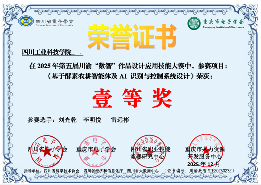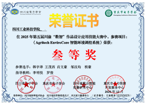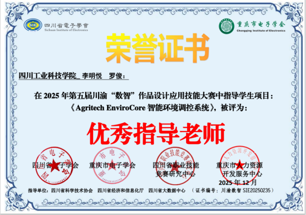 在参赛作品方面,学校选送的项目获得评委高度评价。其中,由刘光乾、李明悦、雷远彬等教师完成的《基于酵素农耕智能体及AI识别与控制系统设计》项目荣获大赛一等奖。该项目聚焦智慧农业,融合人工智能与环境调控技术,具备较强的创新性与应用价值。