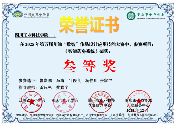 此外,由雷远彬等老师指导,曾嘉鹏等同学完成的《智能药房系统》与由李明悦、罗俊老师指导,韩宇泽等同学完成的《Agritech EnviroCore智能环境调控系统》两个项目均获三等奖。这些项目涵盖了智慧医疗、智能农业等多个“数智化”热点领域,展现了学生们敏锐的技术洞察力和解决实际问题的能力。