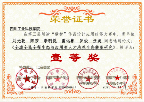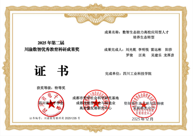 值得关注的是,依托大赛实践开展的数智教育研究亦取得重要突破。由刘光乾、李明悦、雷远彬、阳莎、罗俊、汪美、吴建乐、龙厚彦等老师共同完成的科研项目《数智生态助力高校应用型人才培养生态转型》,荣获2025年第二届川渝数智优秀教育科研成果特等奖;由刘光乾、阳莎、李明悦、雷远彬、罗俊、汪美等同志撰写的相关论文《全域全民全程生态与应用型人才培养生态转型研究》荣获大赛论文评选一等奖。这些成果表明,学校在“数智”领域的探索已从技术应用延伸至人才培养生态的理论构建,形成了实践驱动、理论提升的良性发展格局。