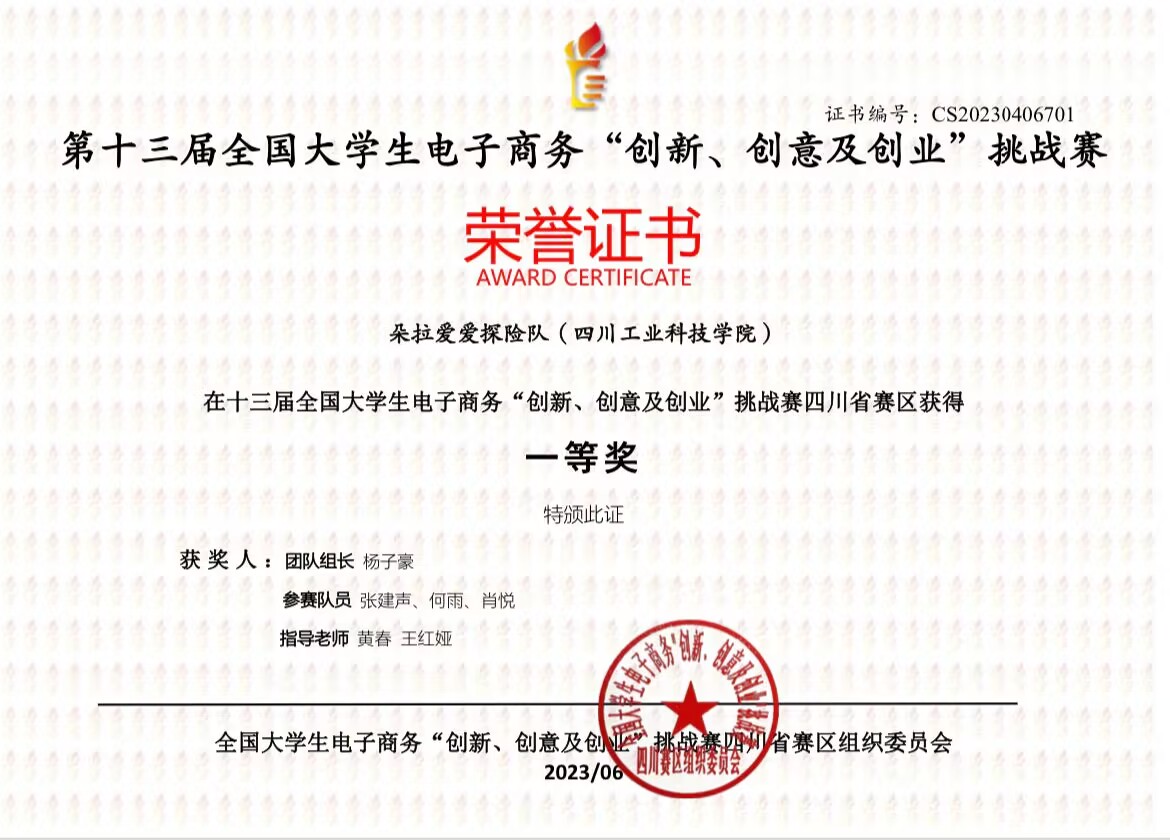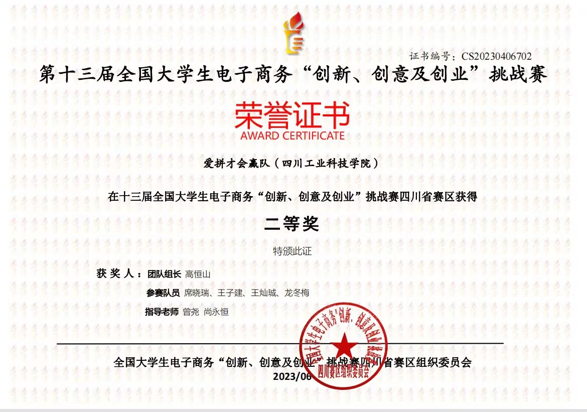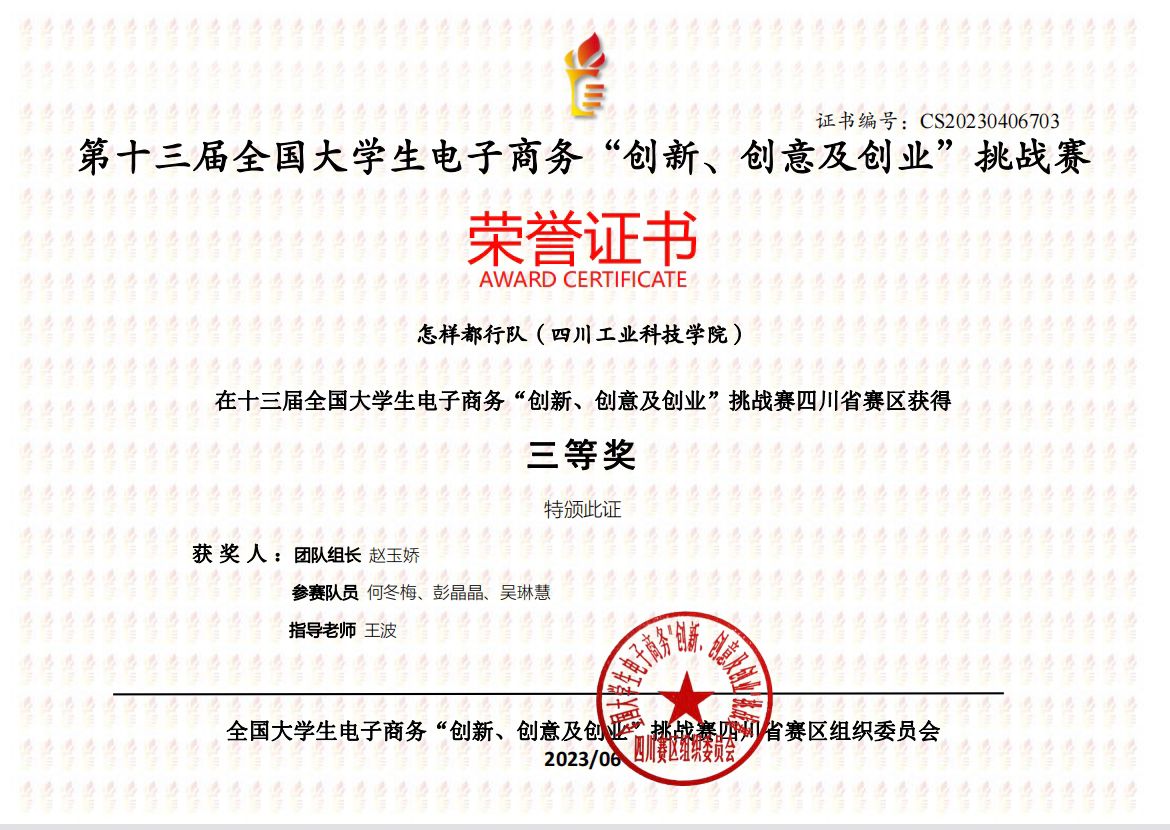 近日,第十三届全国大学生电子商务“创新、创意及创业”挑战赛(简称“三创赛”)四川赛区总决赛获奖结果出炉,我校学生杨子豪、高恒山等人组成的团队在大赛的激烈角逐中分别斩获四川省一、二、三等奖,特此祝贺!