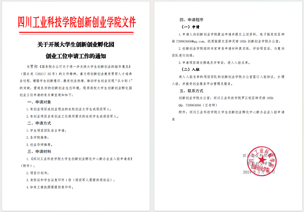 关于开展大学生创新创业孵化园创业工位申请工作的通知