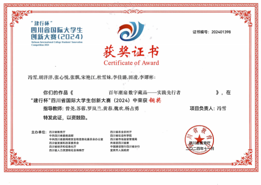11月8日,四川省国际大学生创新大赛(2024)颁奖典礼在西华大学郫都校区举行。学校22级电子商务1班冯雪团队项目“百年潮扇数字藏品——实践先行者”在此次大赛中荣获省级铜奖。