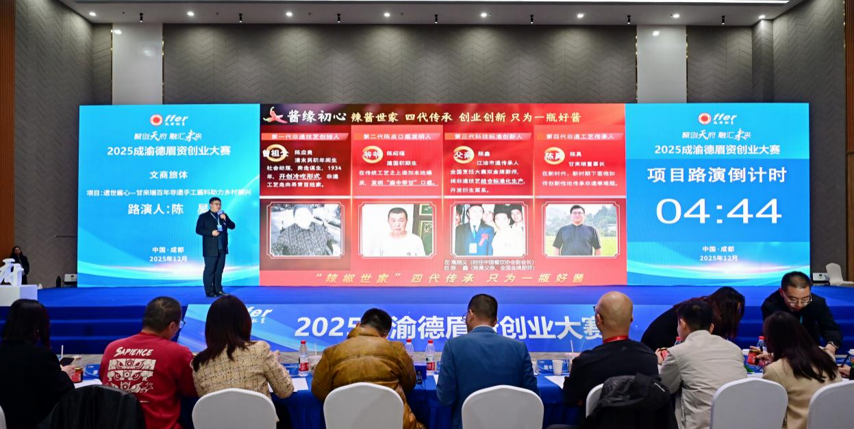 12月3日,由成都市就业服务管理局主办的2025年成渝德眉资创业大赛在成都顺利举行。本次大赛共吸引来自成都、重庆、德阳、眉山、资阳五地的900余个项目参赛。学校陈昊同学负责的“遗世匠心—甘来瑞百年非遗手工酱料助力乡村振兴”项目表现突出,最终荣获大赛优胜奖。