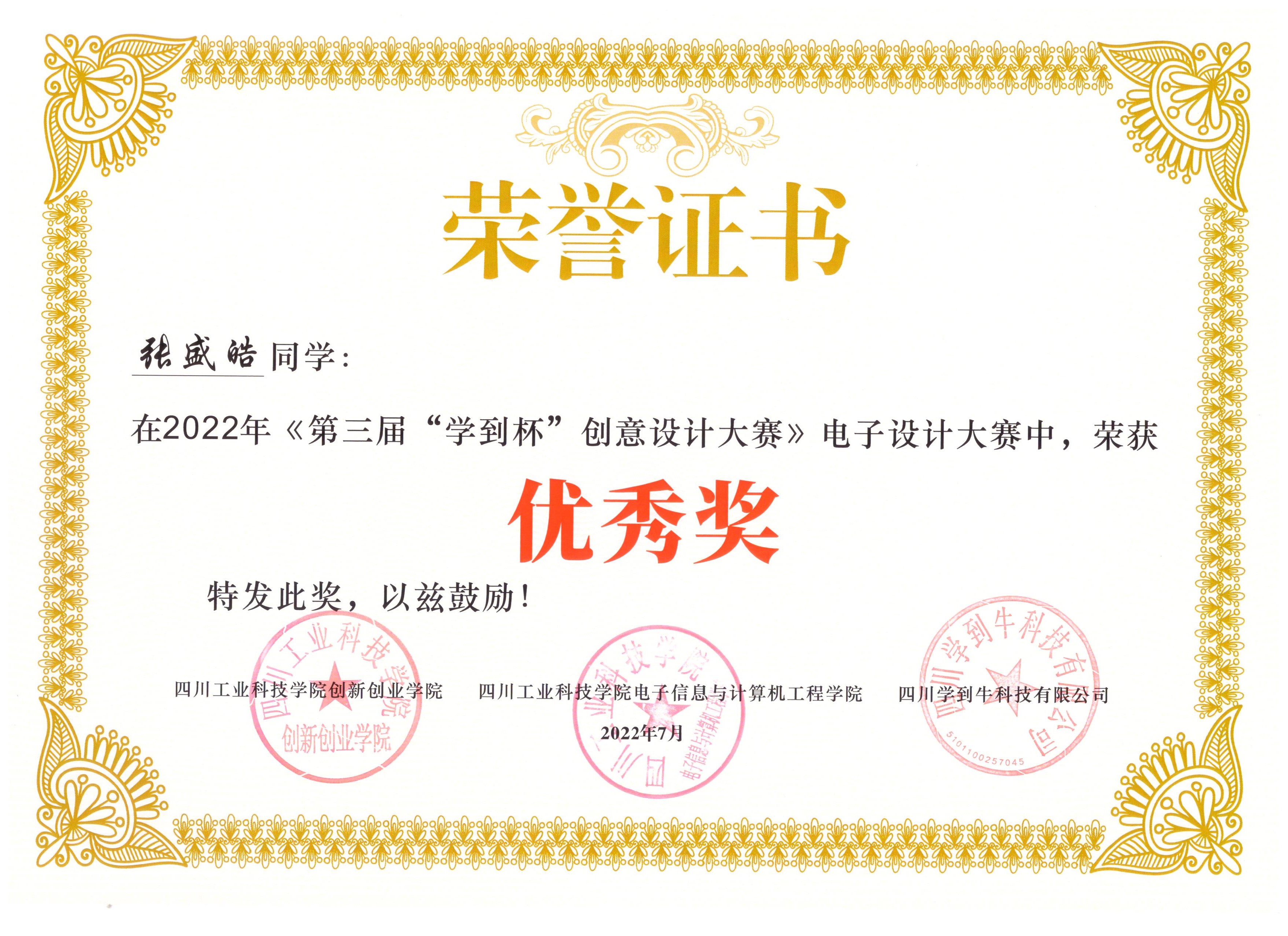 2022《第三届“学到杯”创意设计大赛》电子设计大赛奖状
