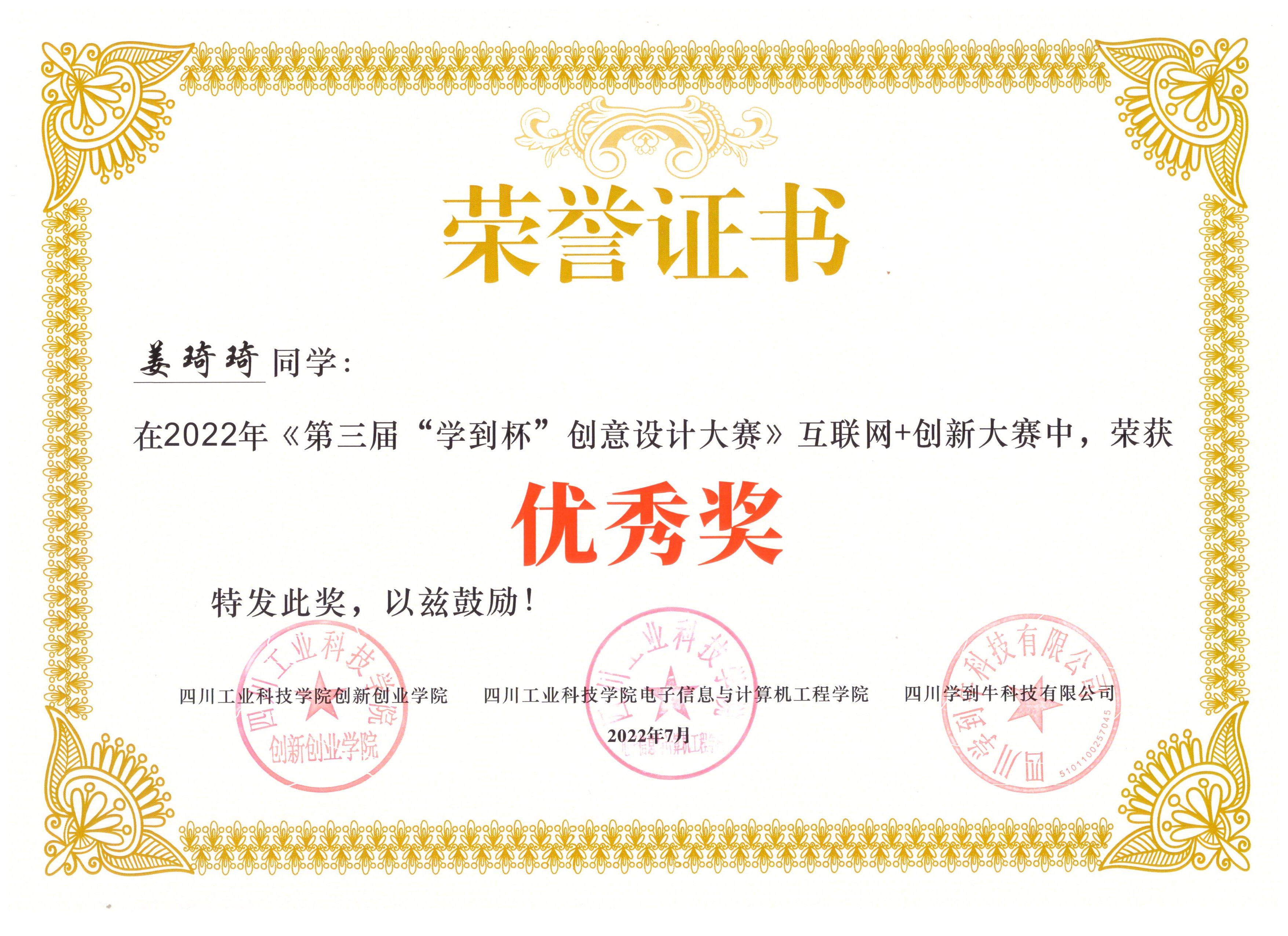 2022《第三届“学到杯”创意设计大赛》互联网+创新大赛奖状