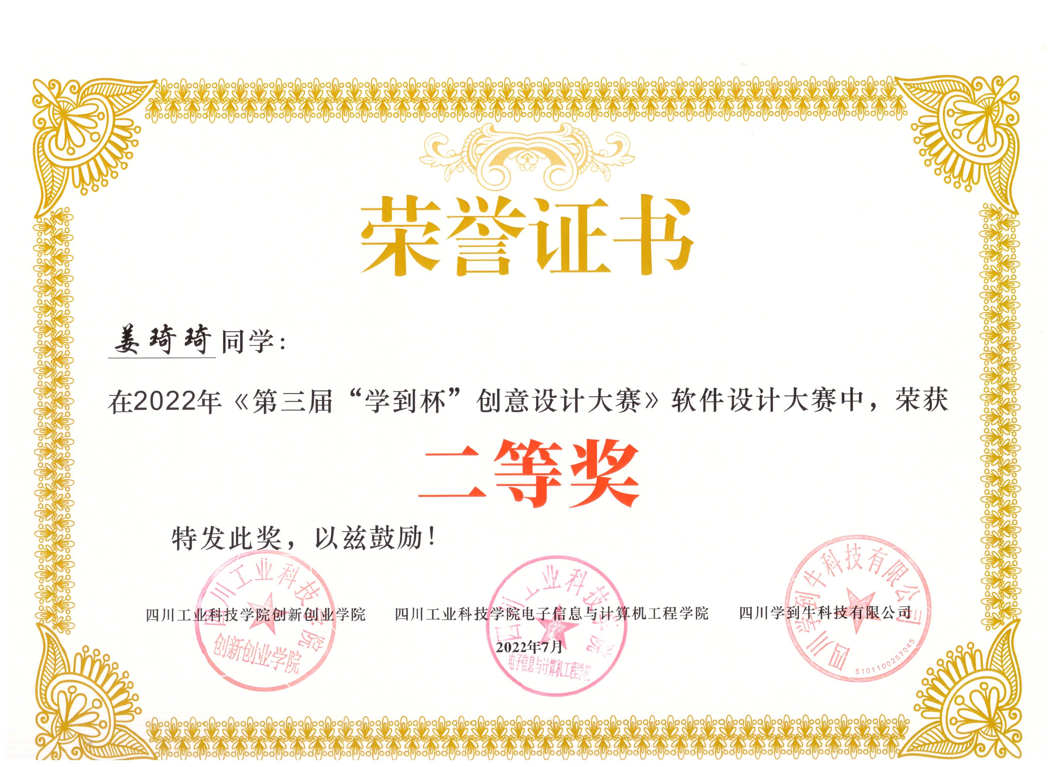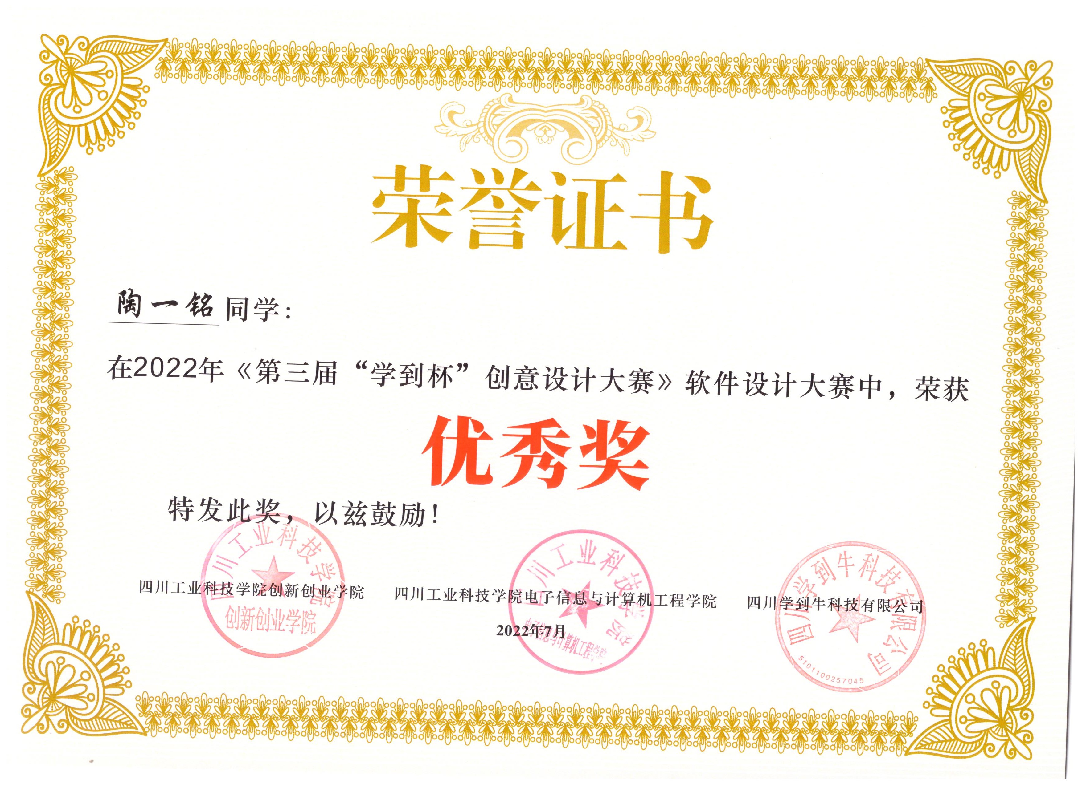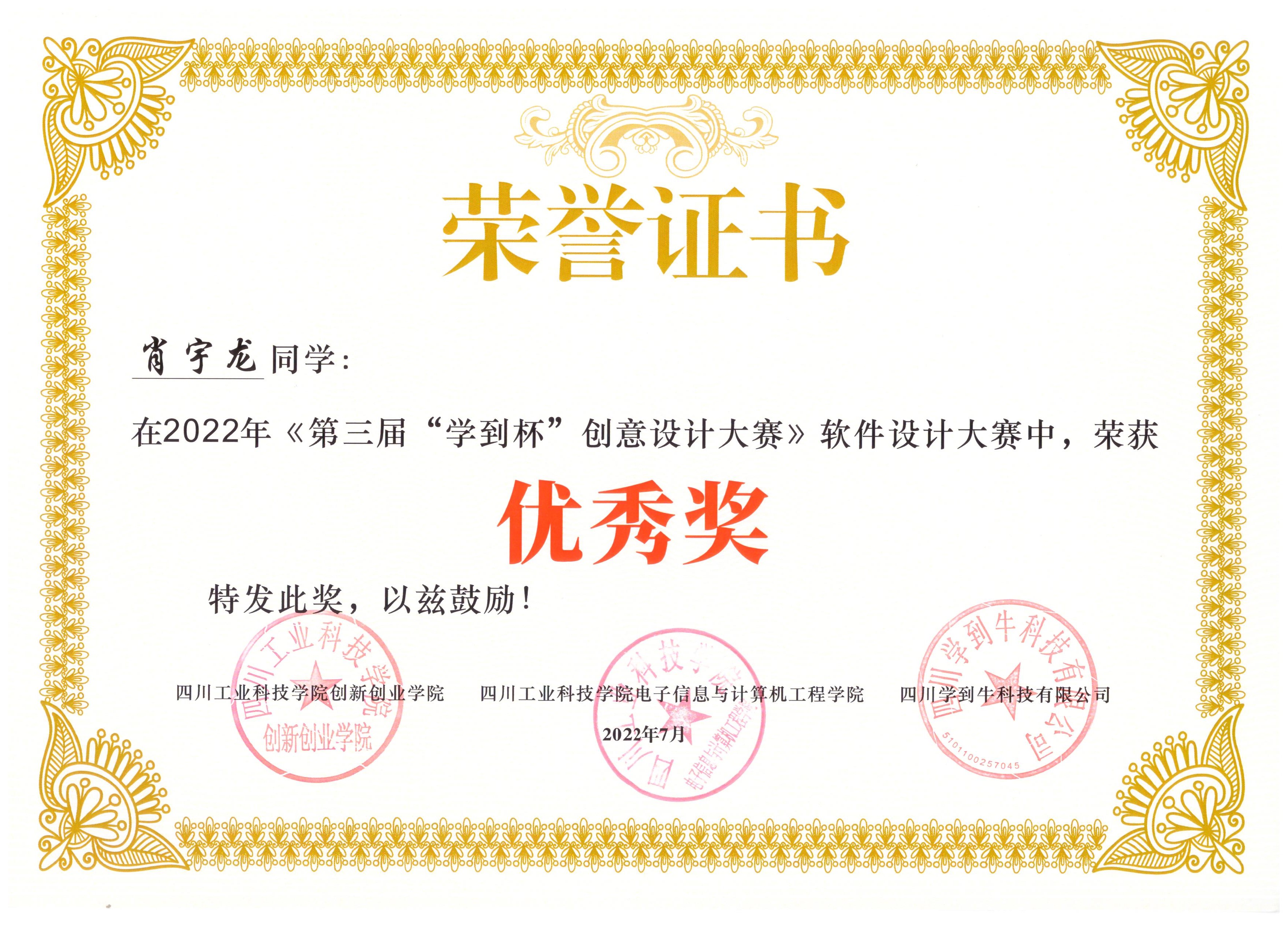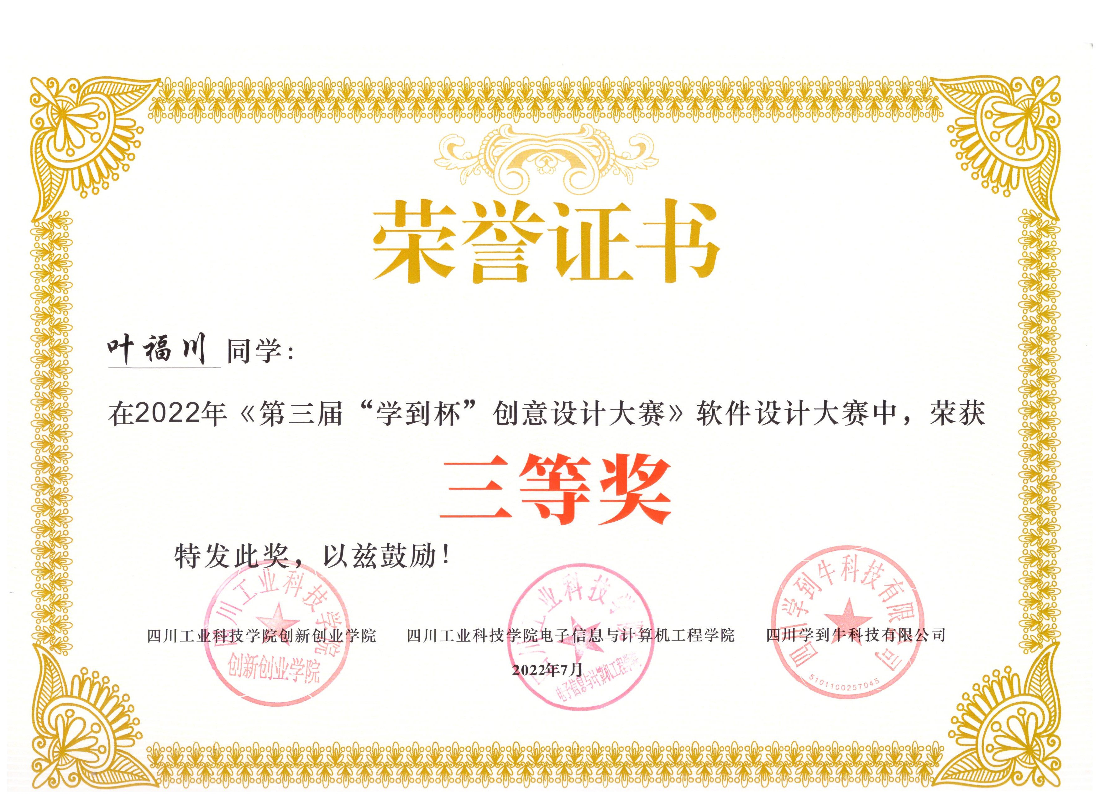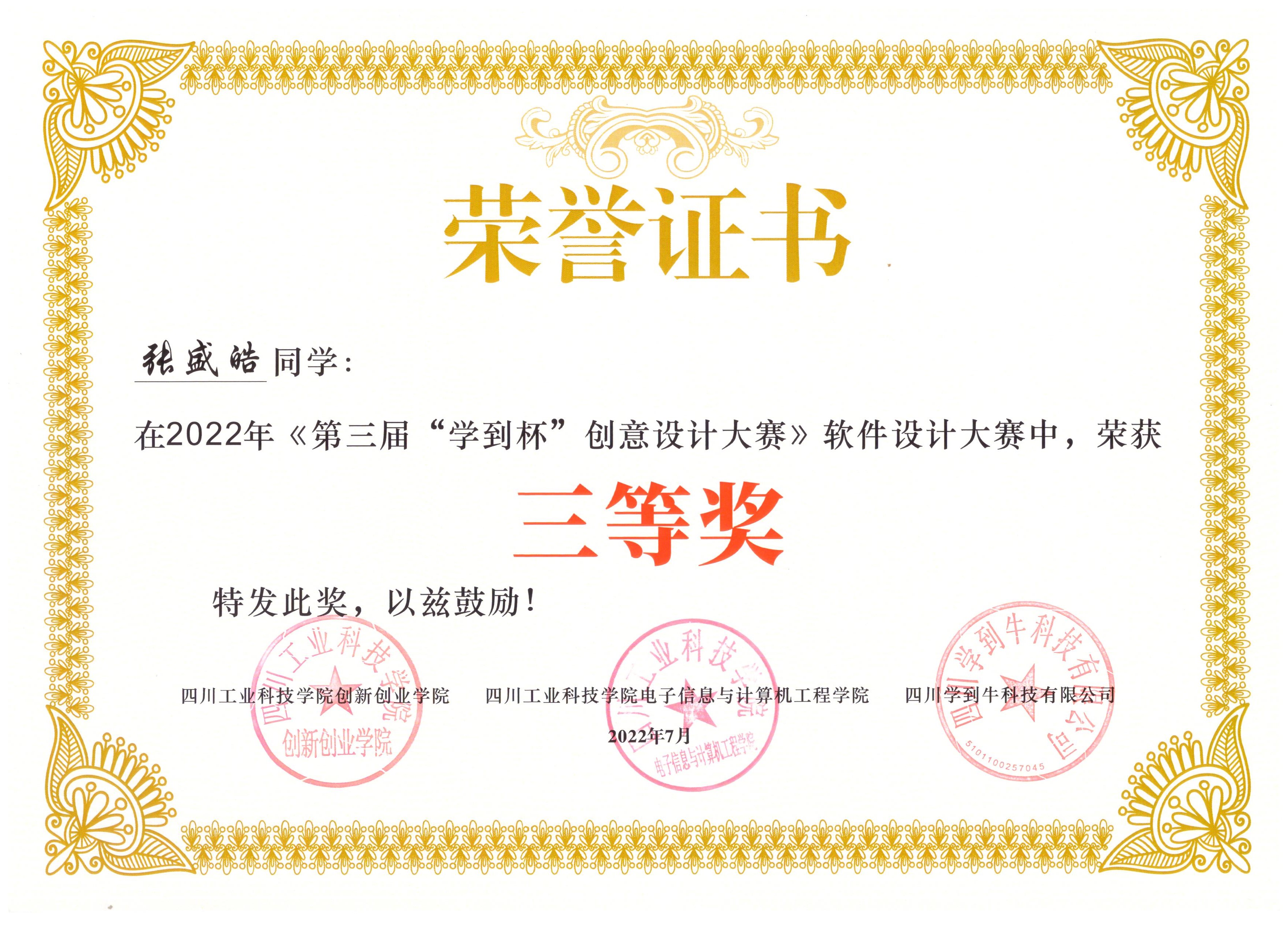 2022《第三届“学到杯”创意设计大赛》软件设计大赛奖状