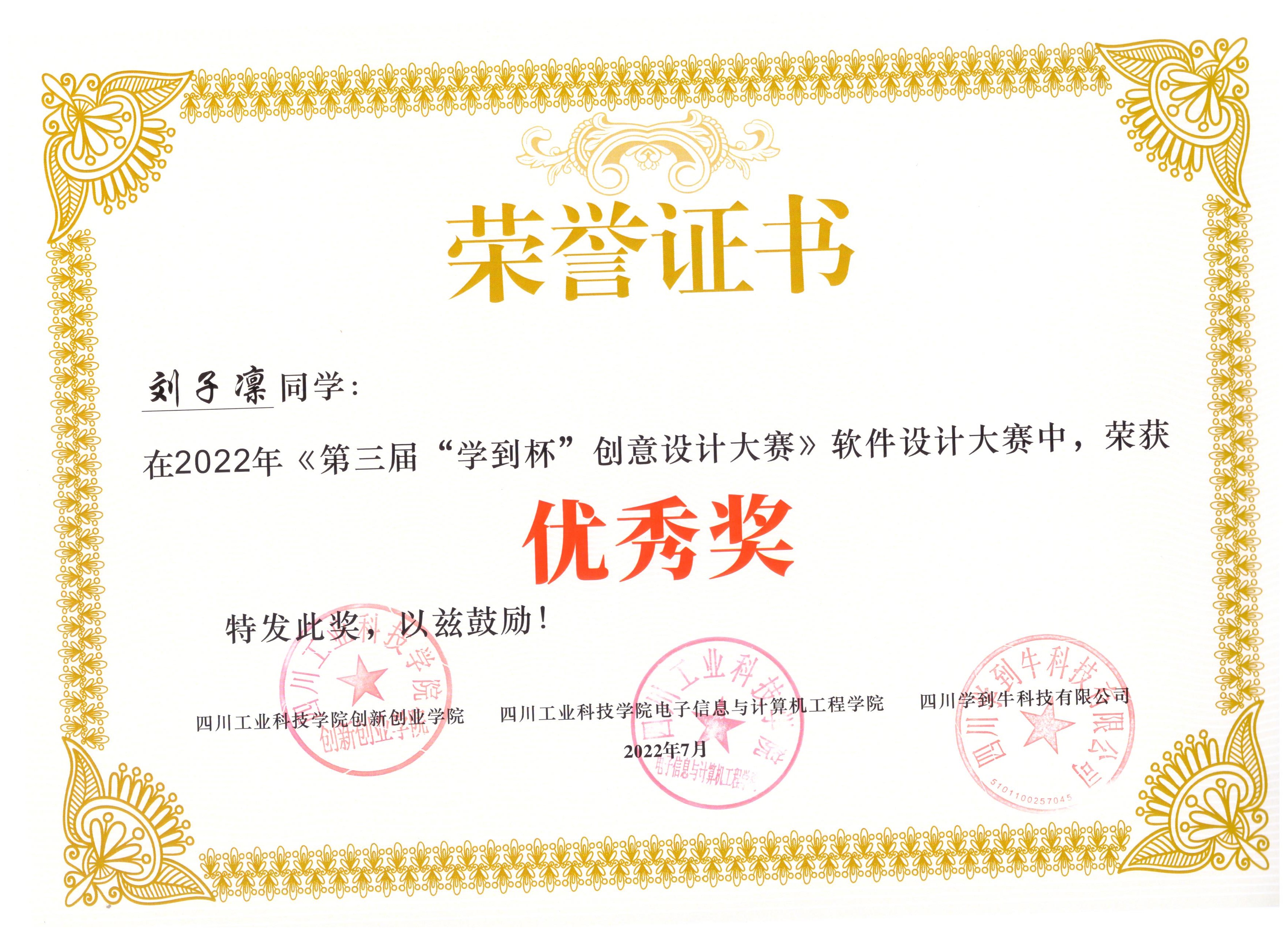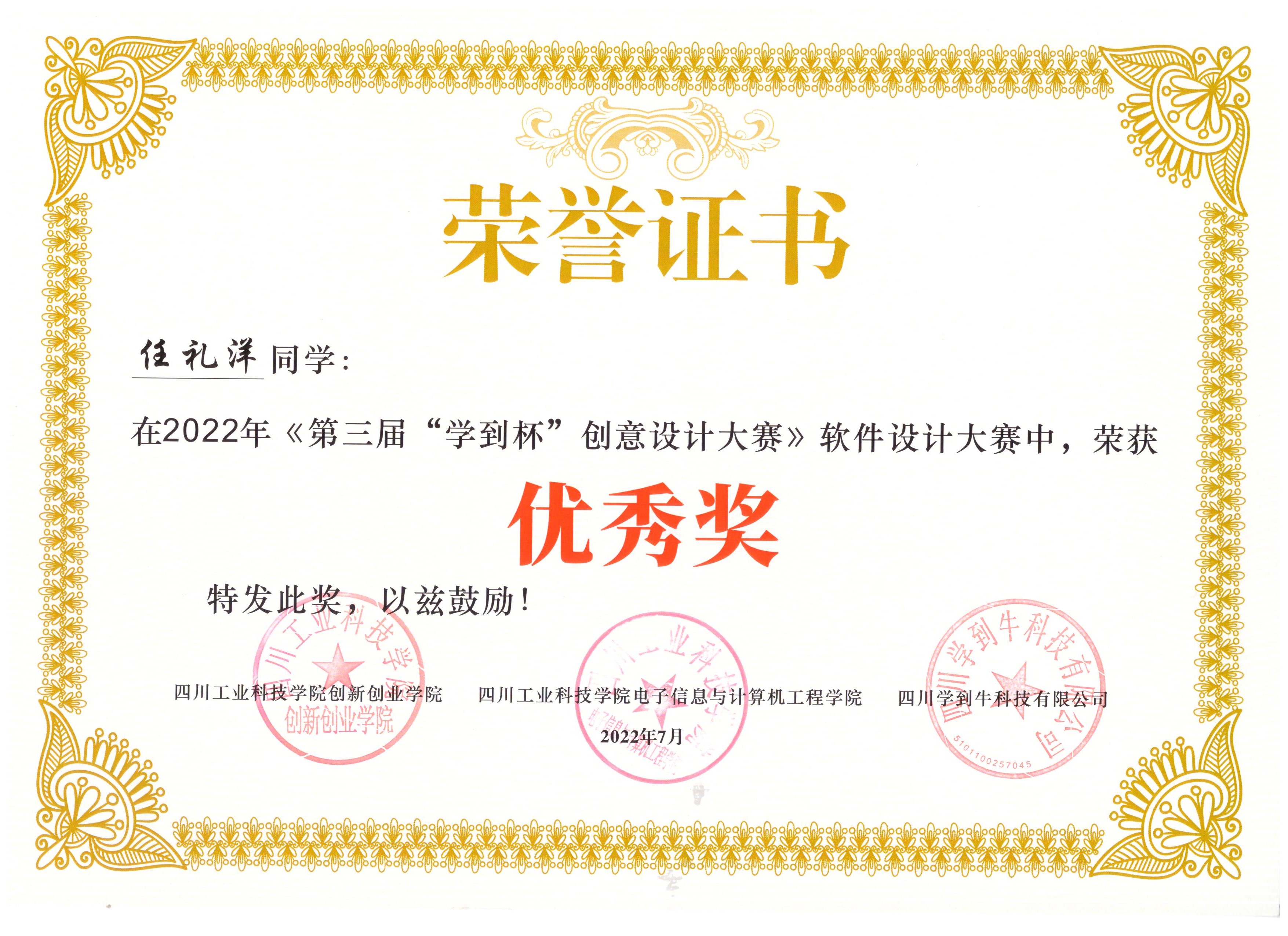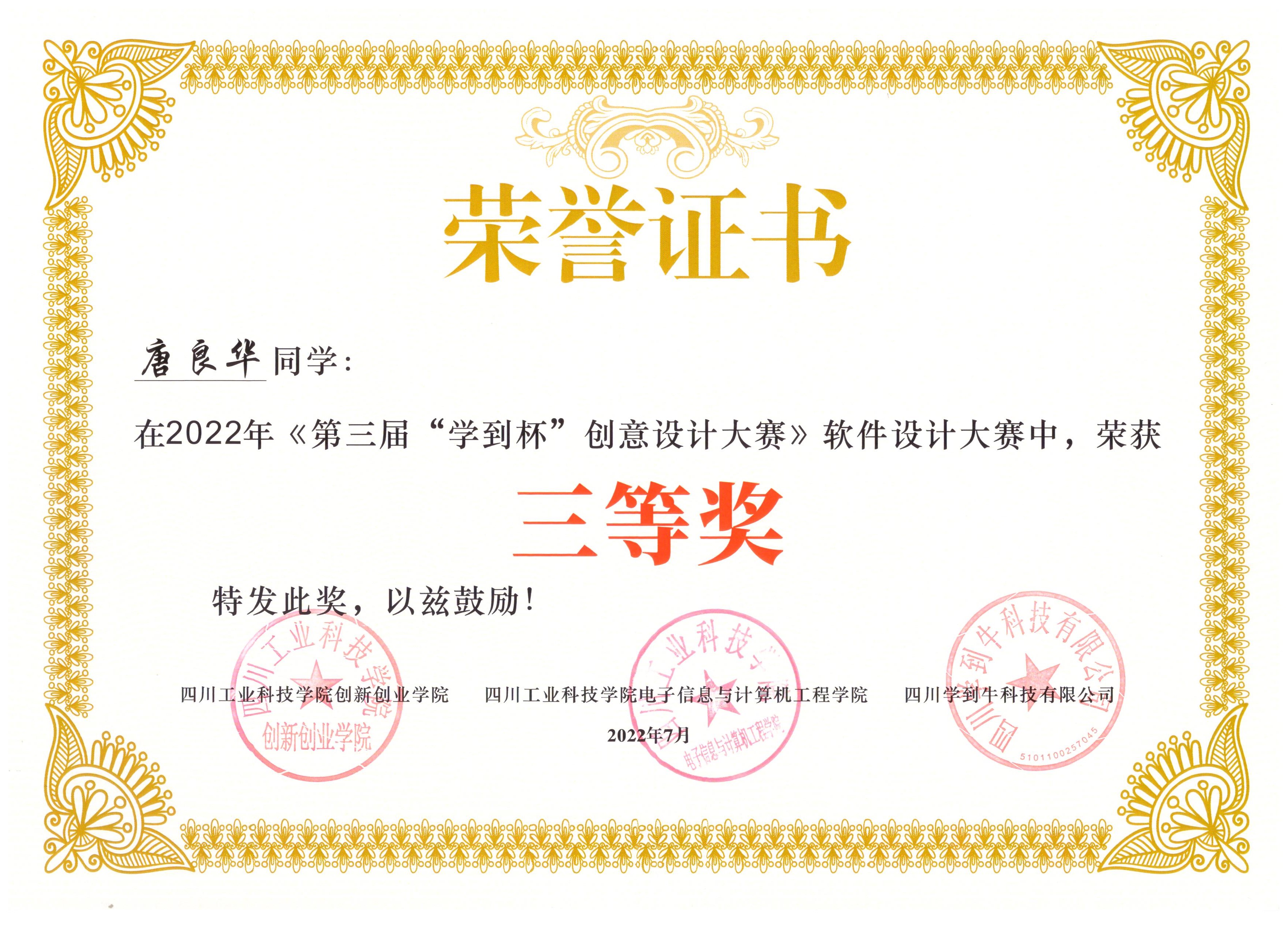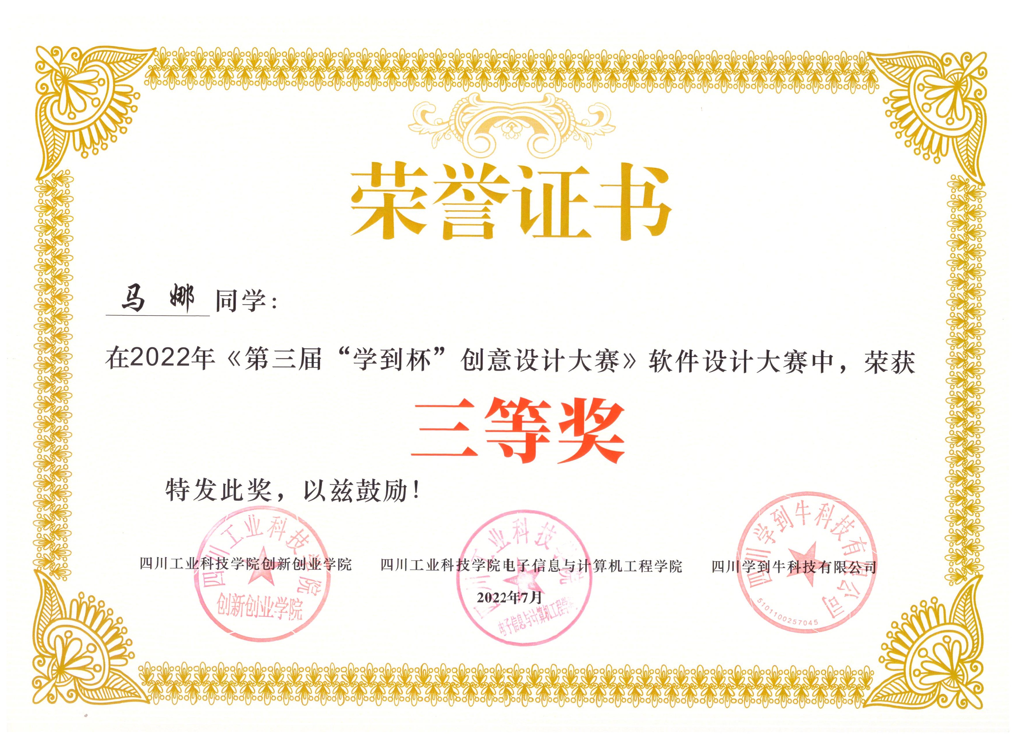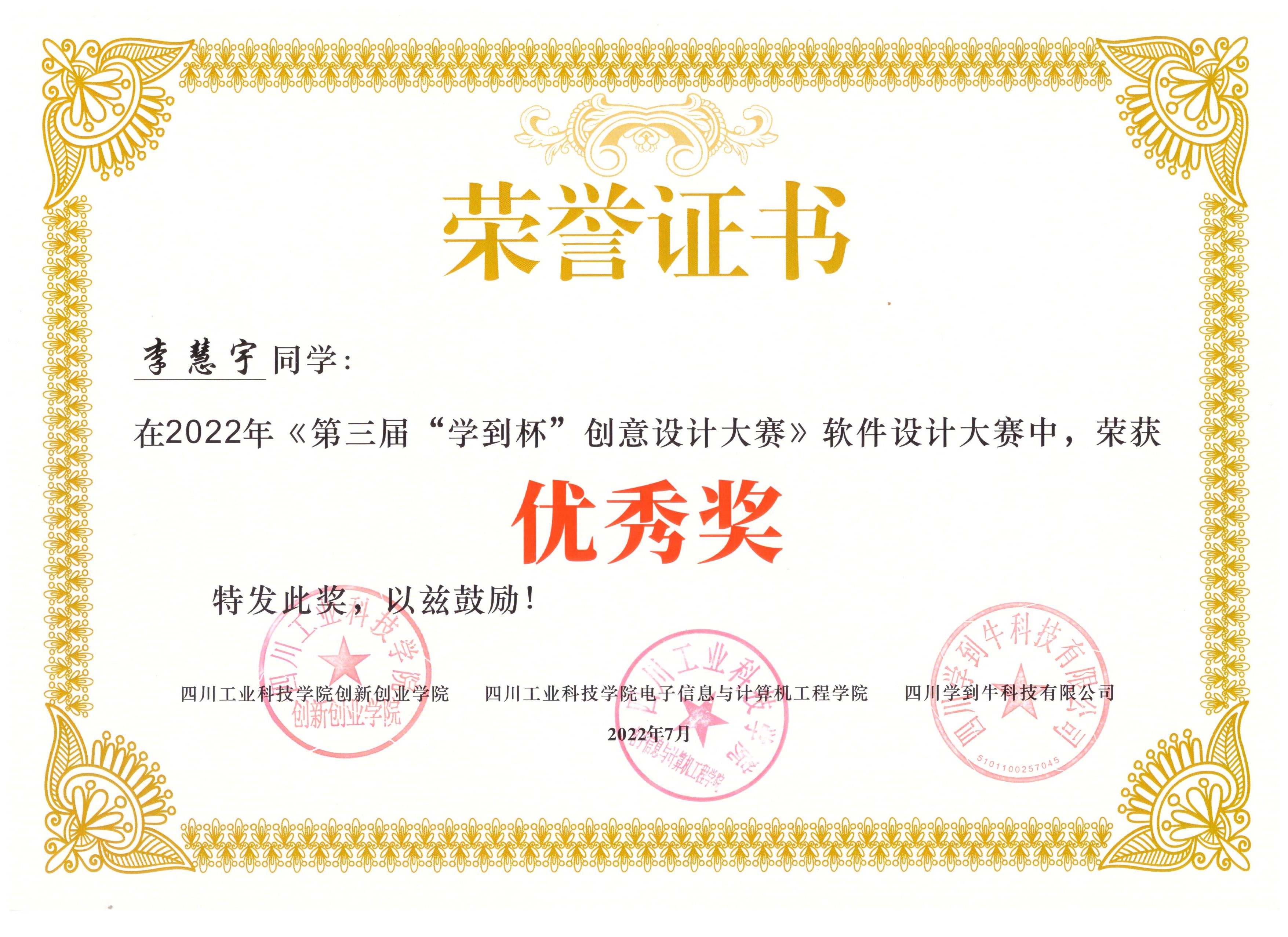 2022《第三届“学到杯”创意设计大赛》软件设计大赛奖状