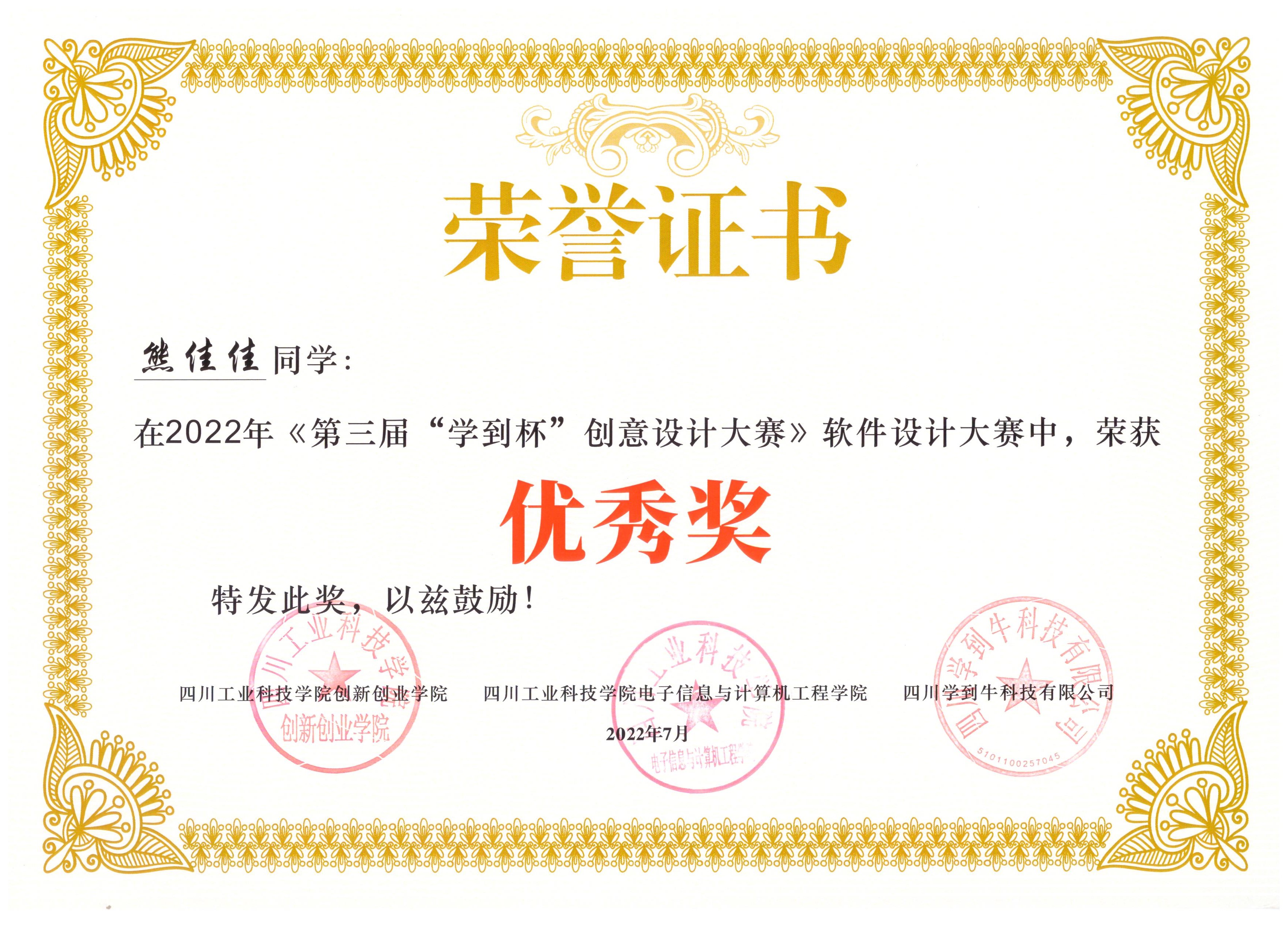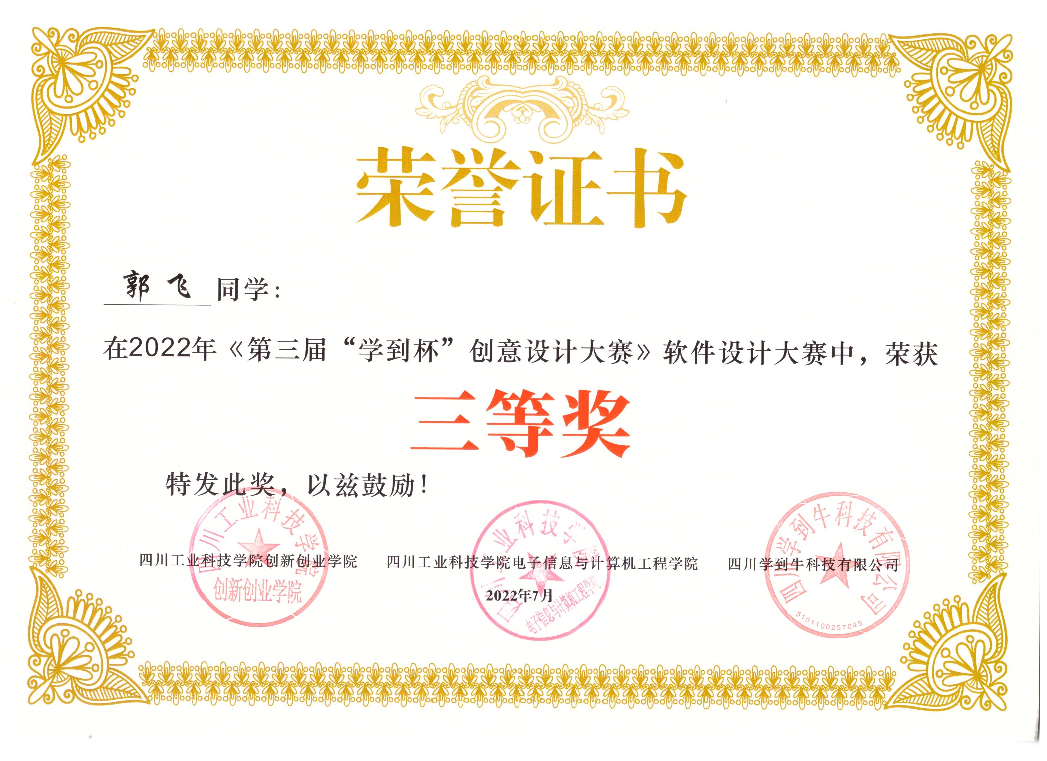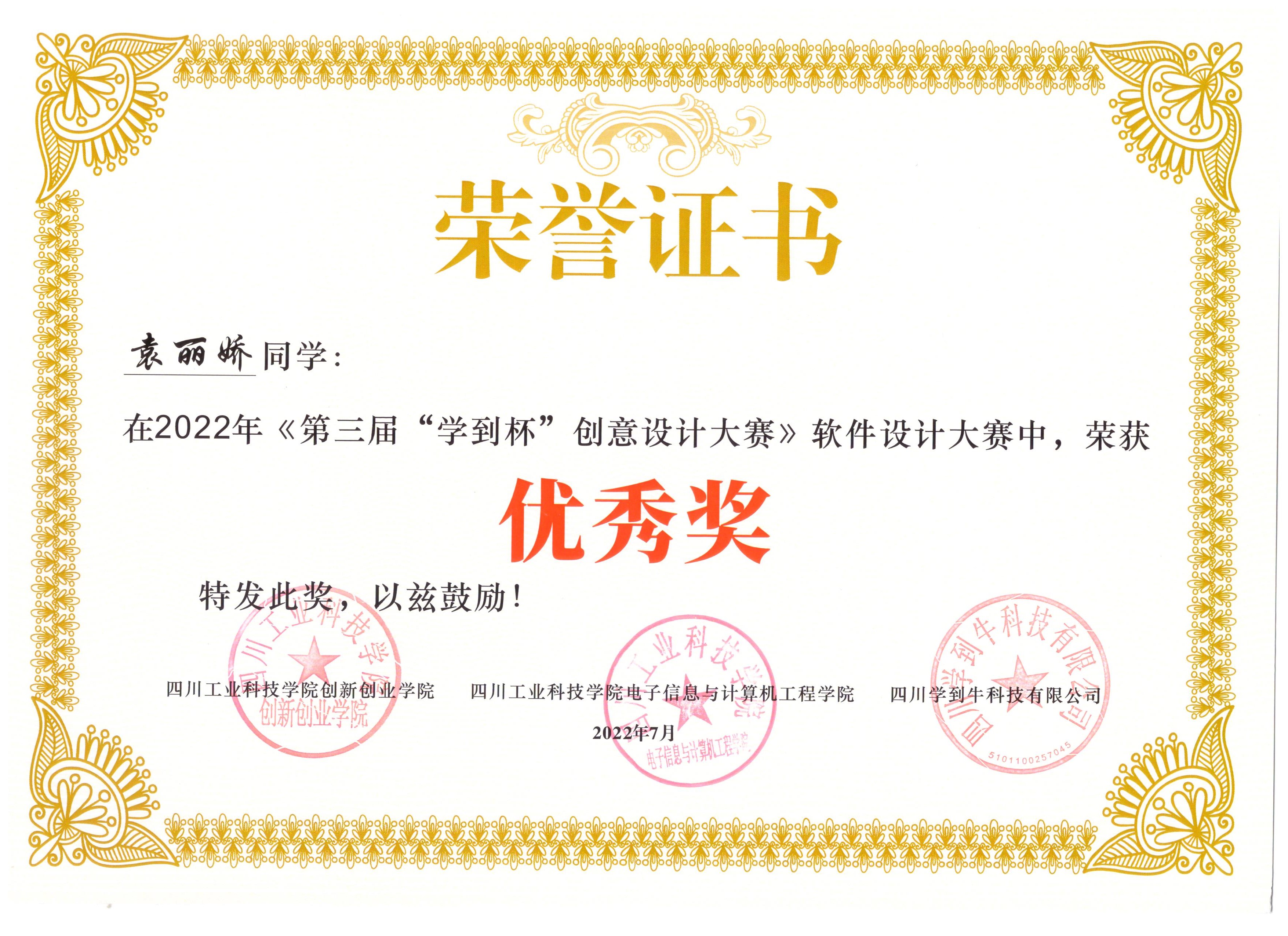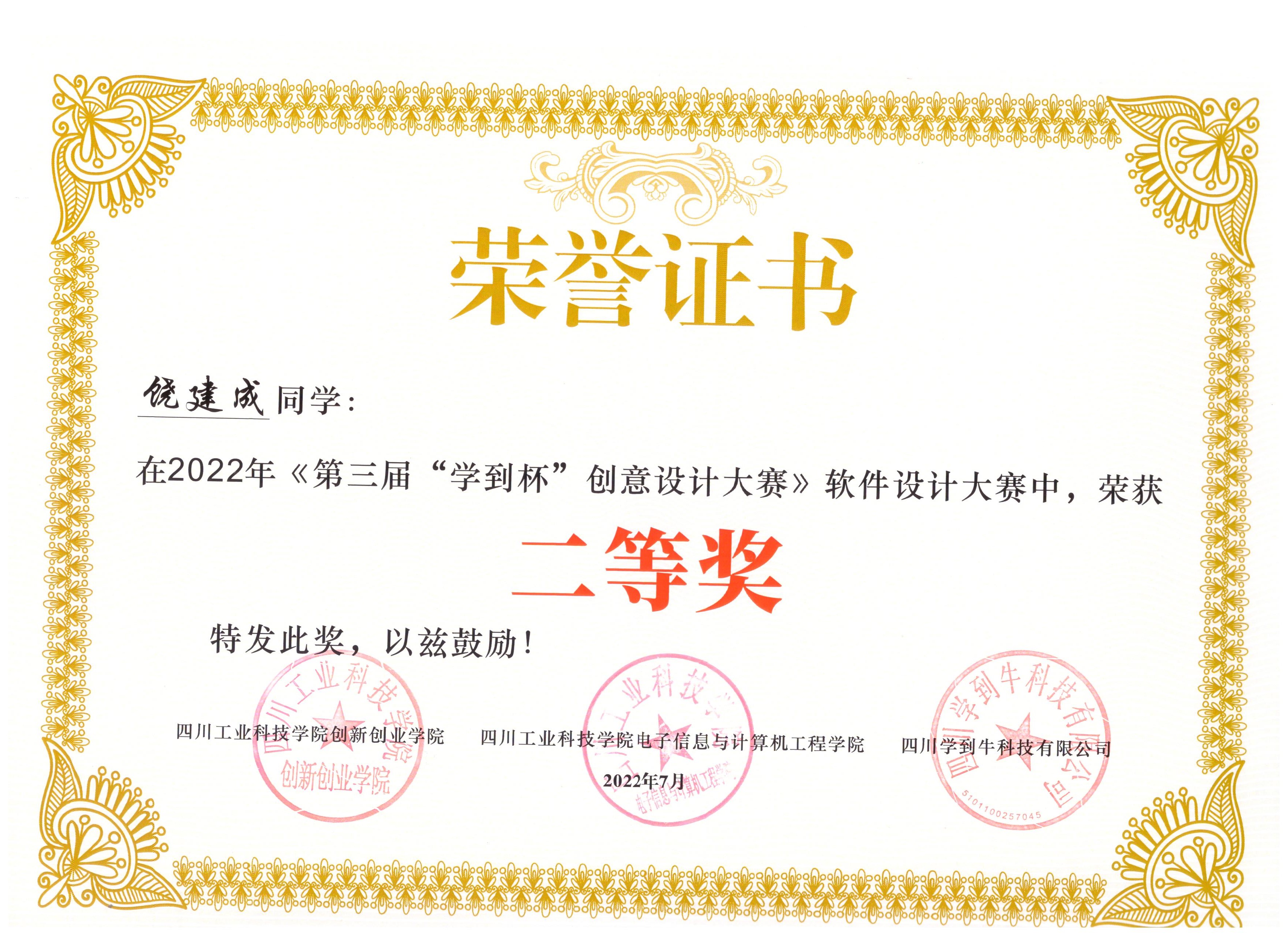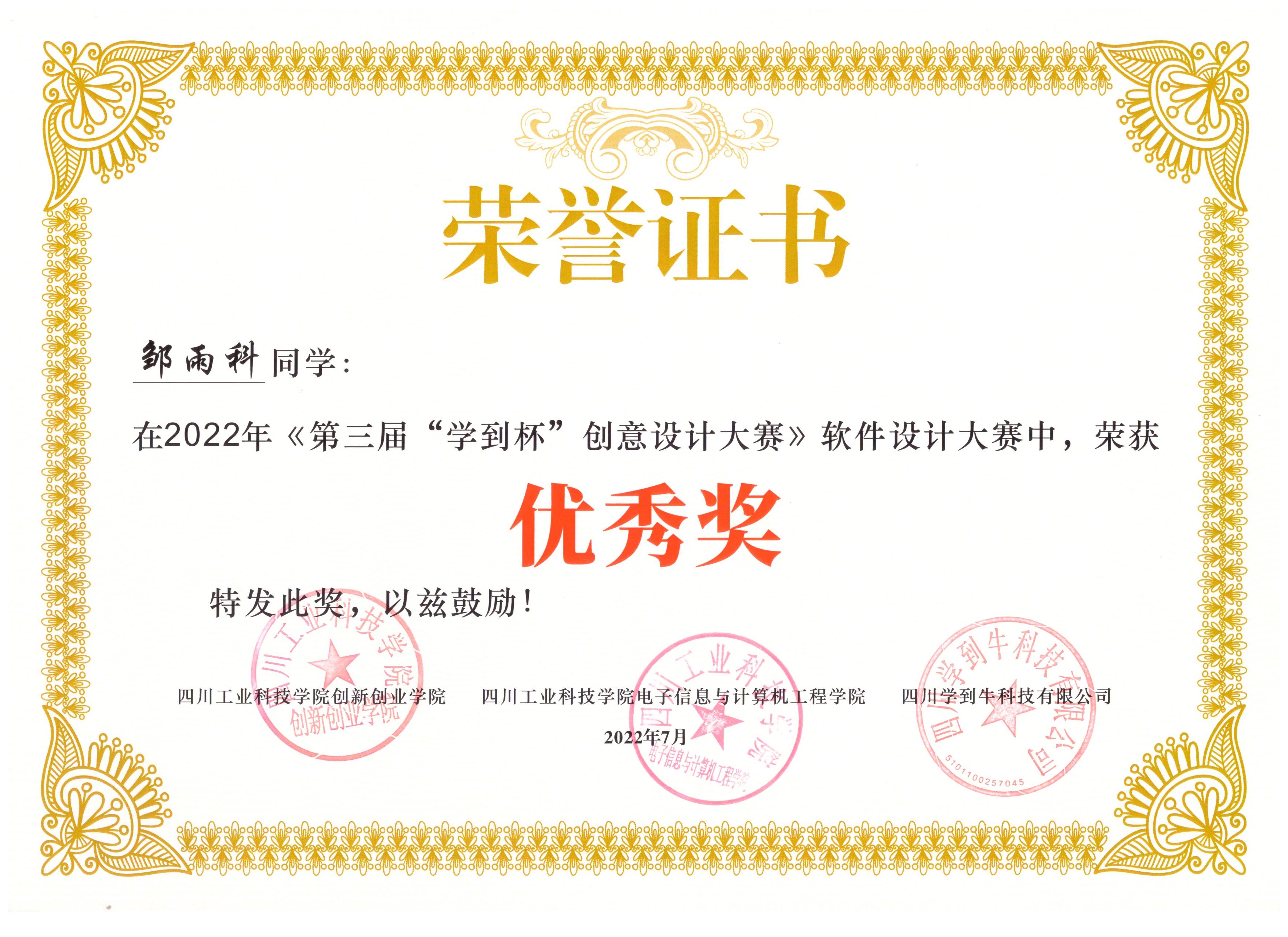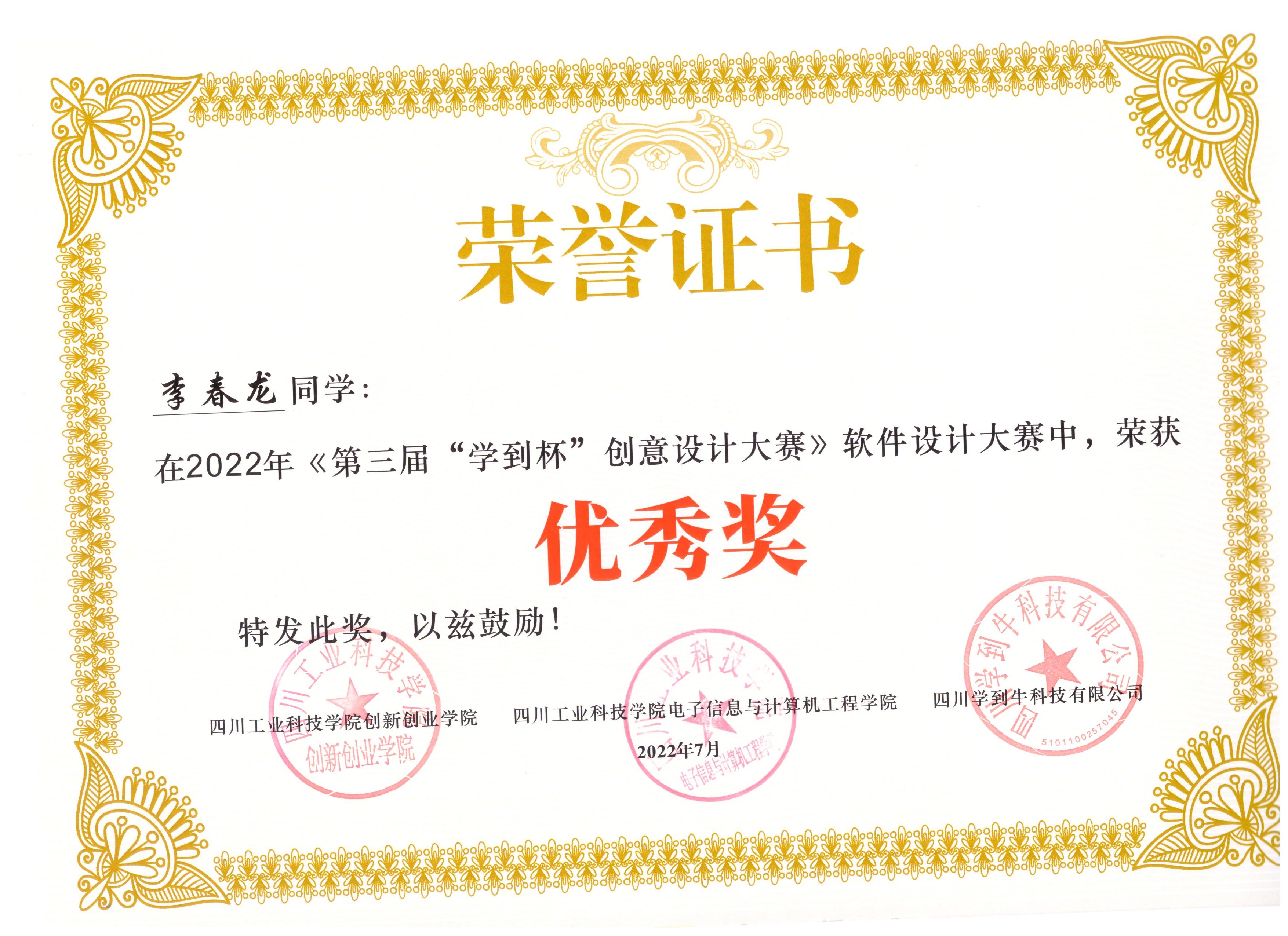 2022《第三届“学到杯”创意设计大赛》软件设计大赛奖状