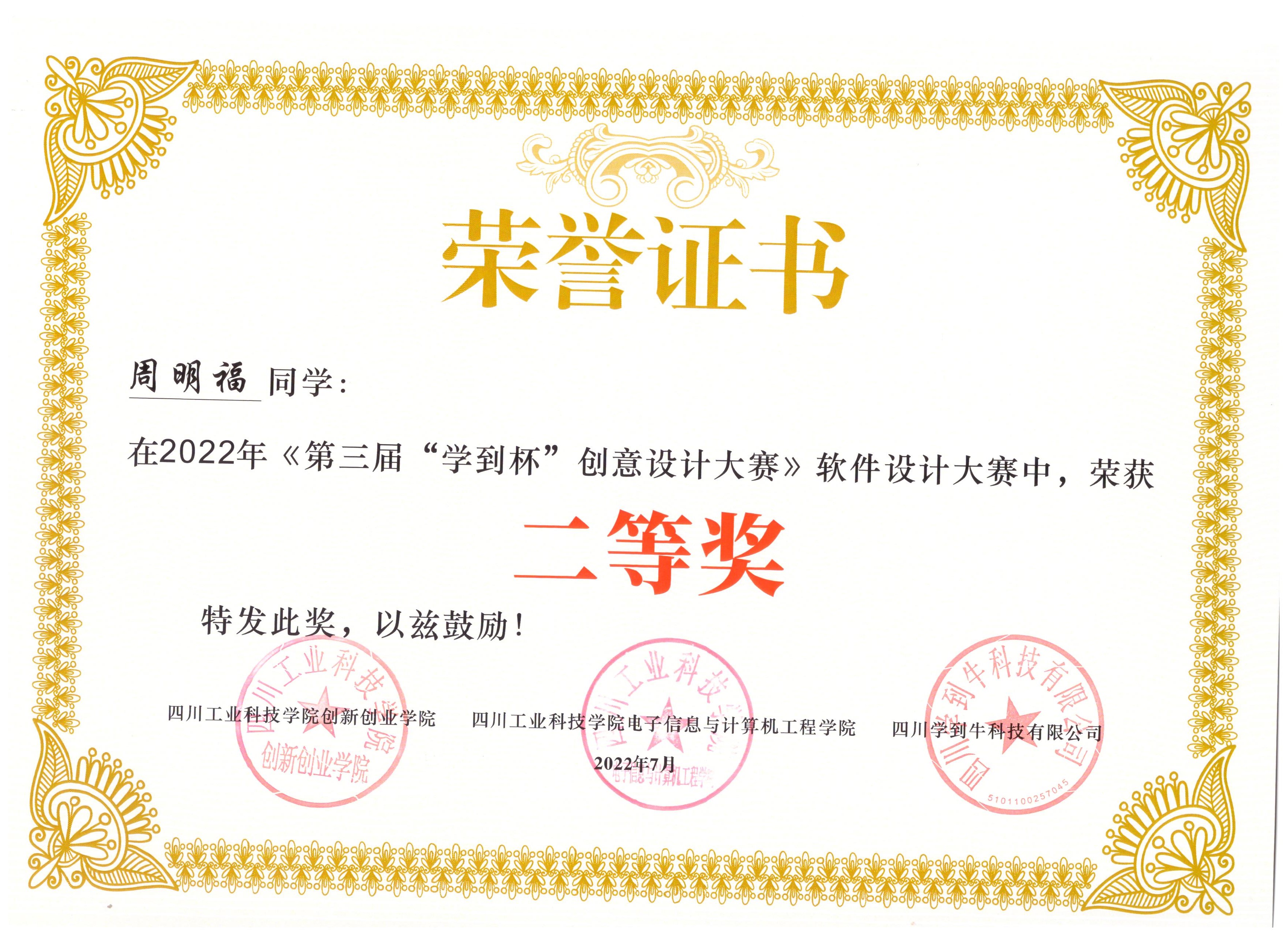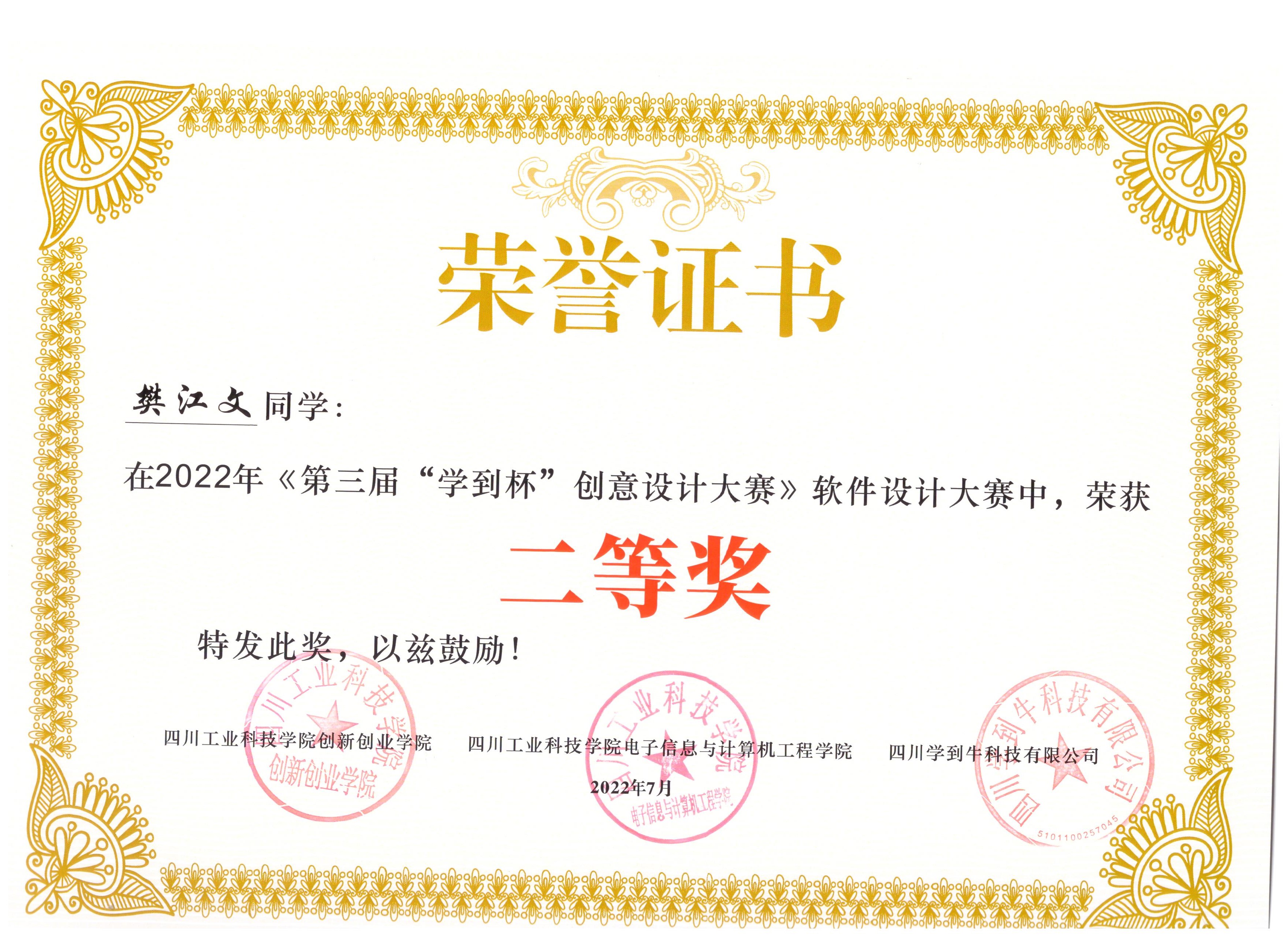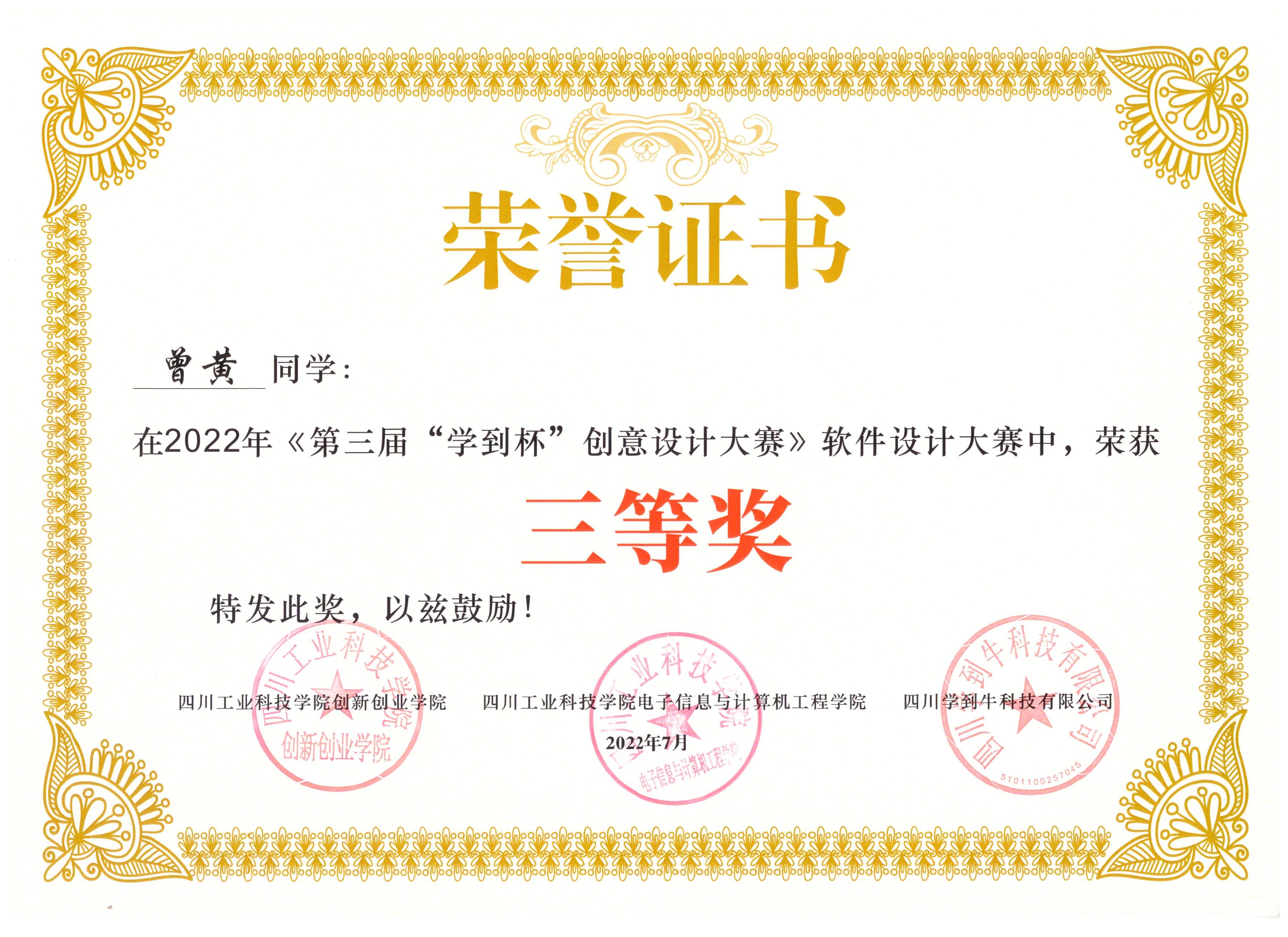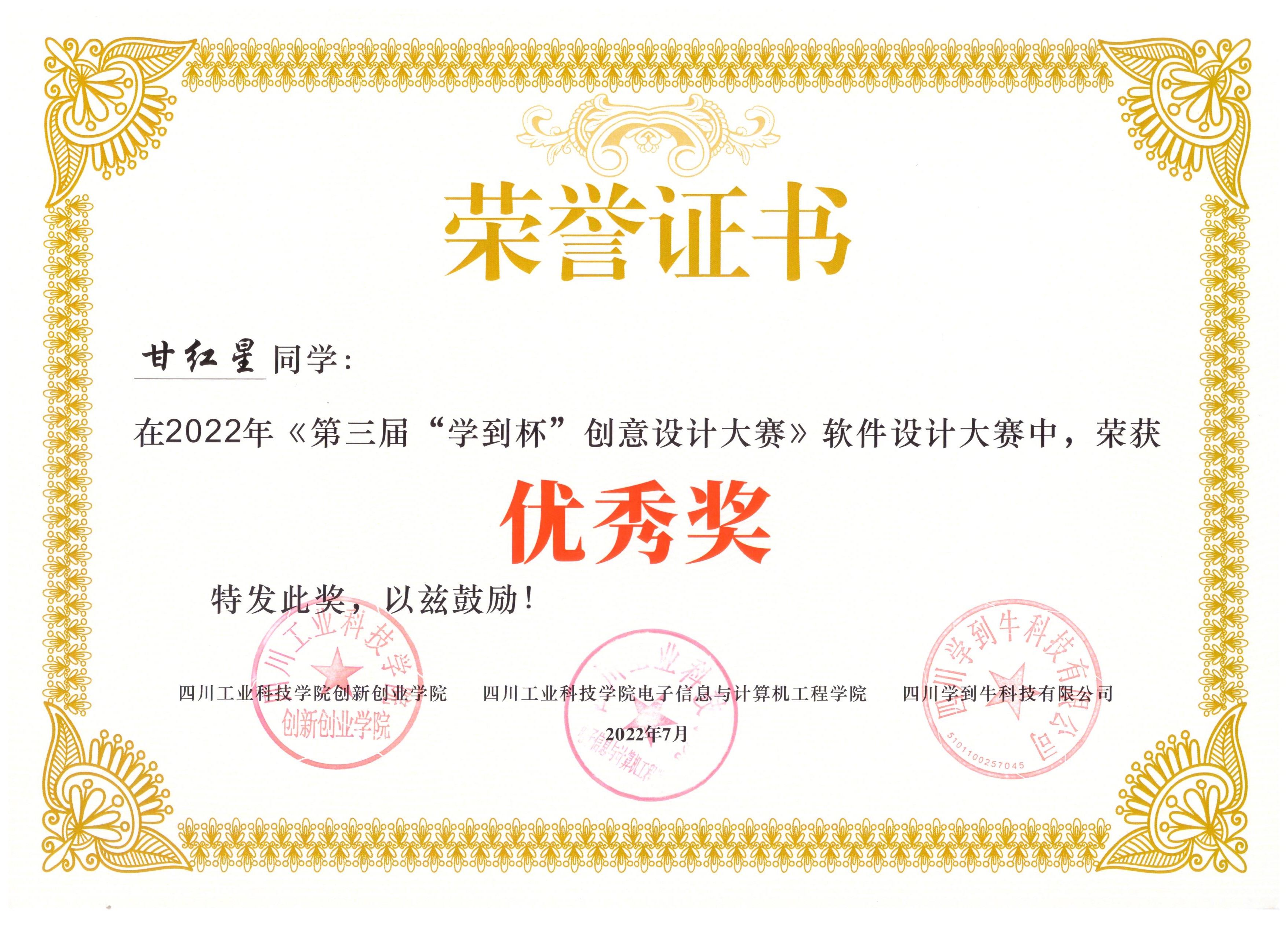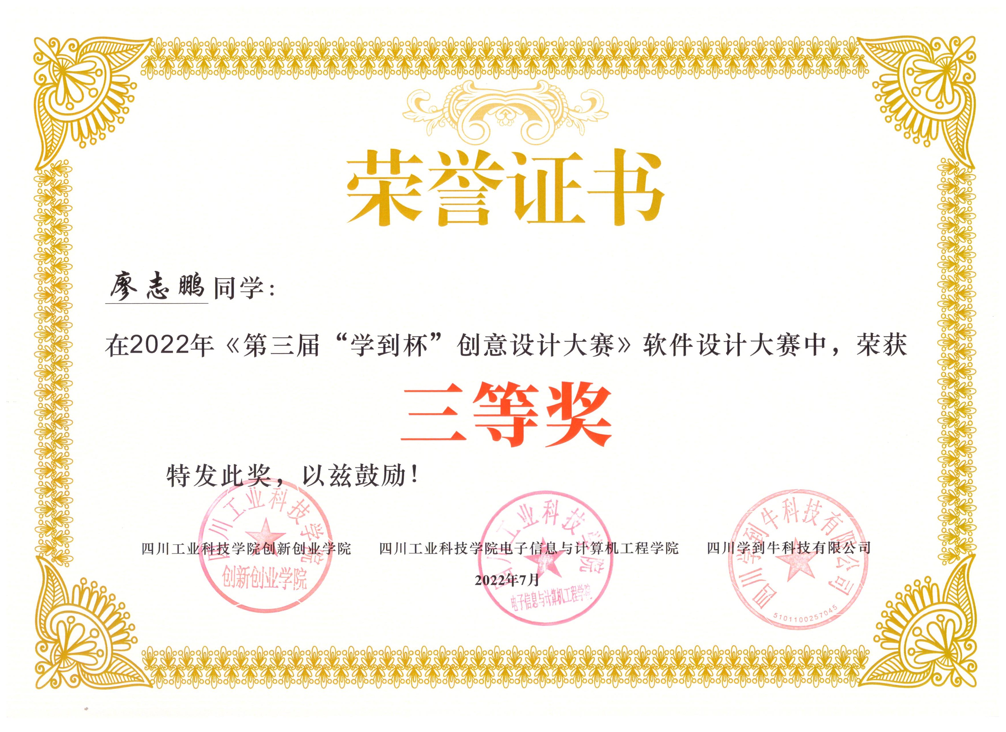 2022《第三届“学到杯”创意设计大赛》软件设计大赛奖状