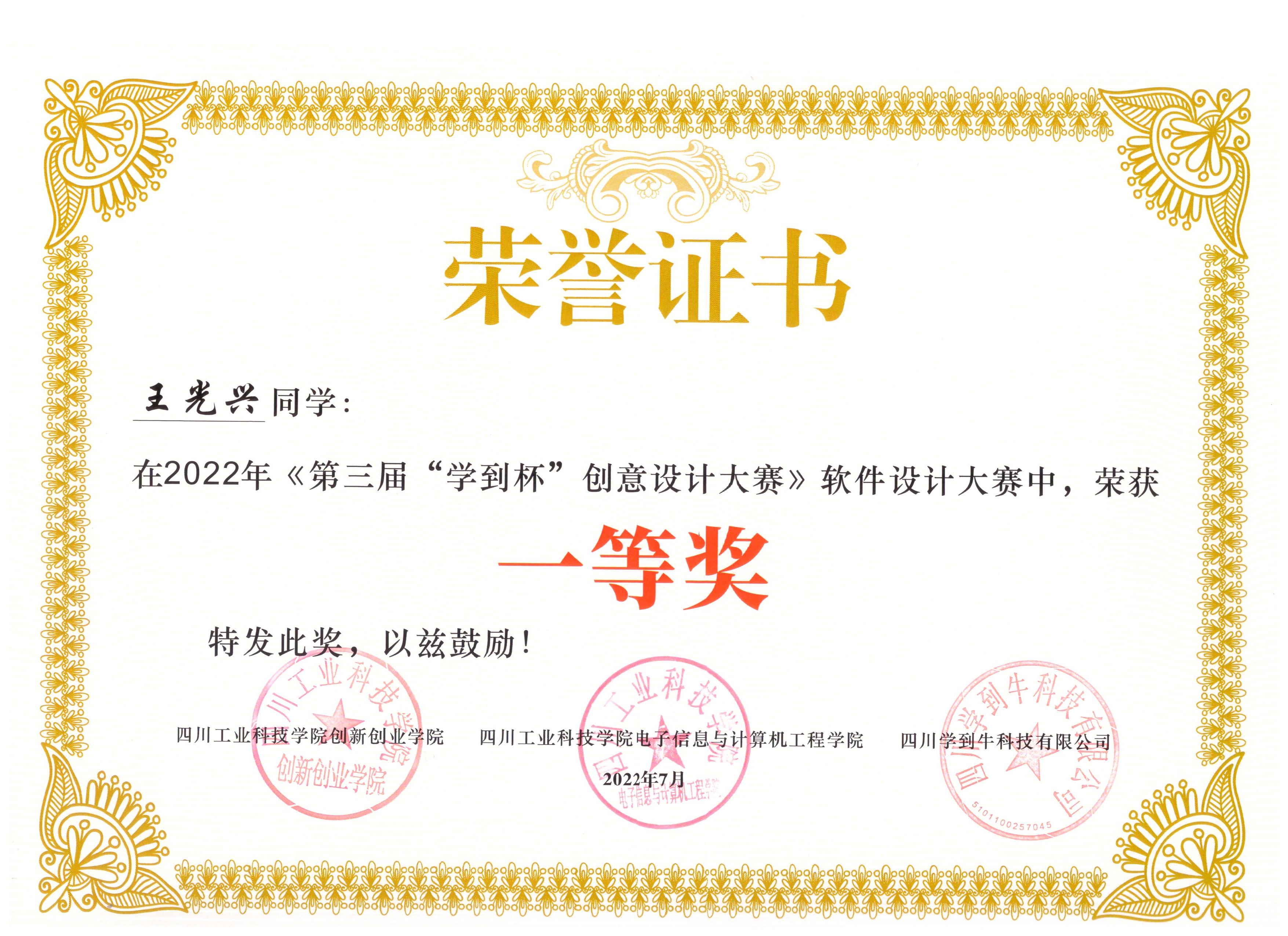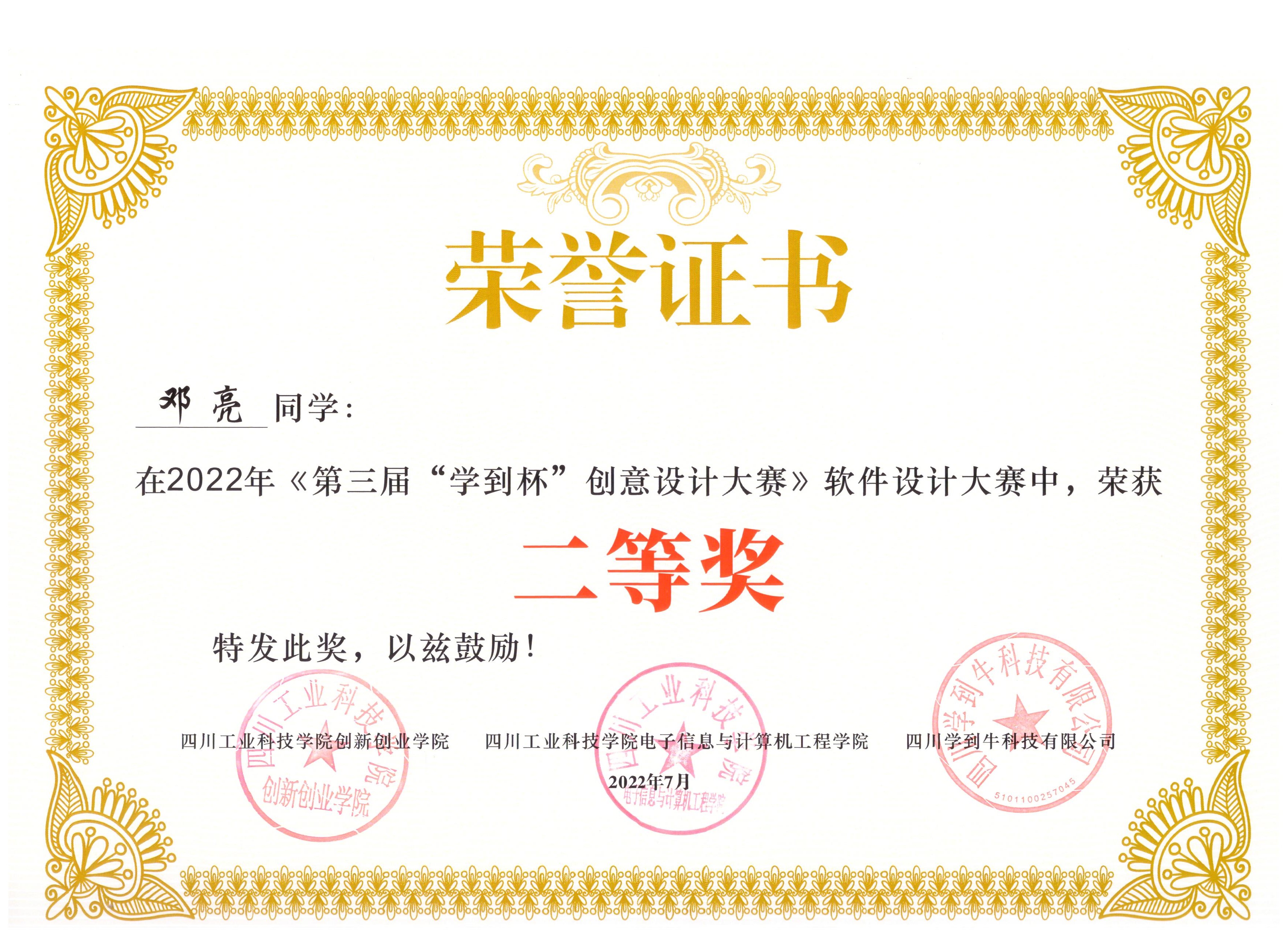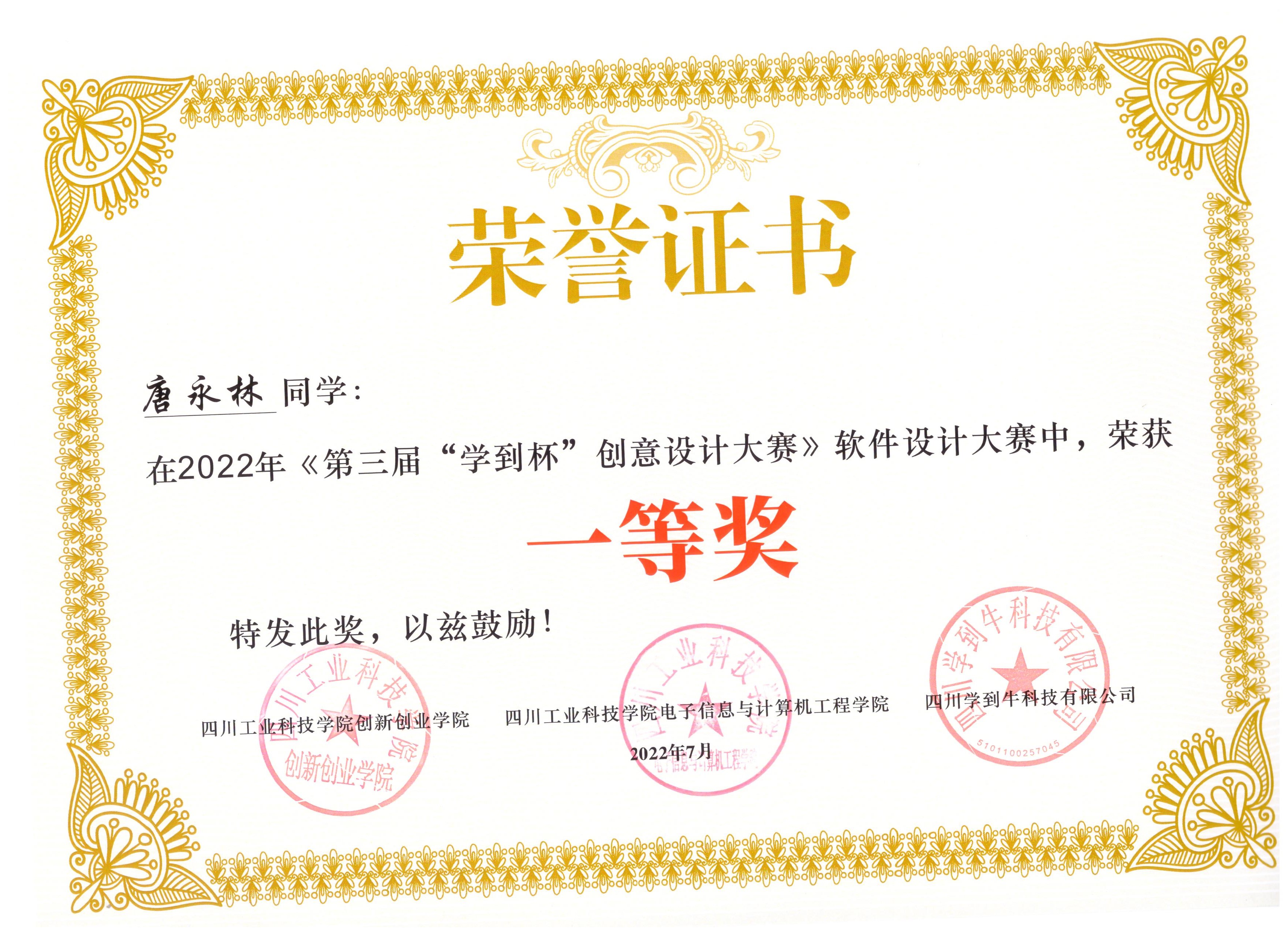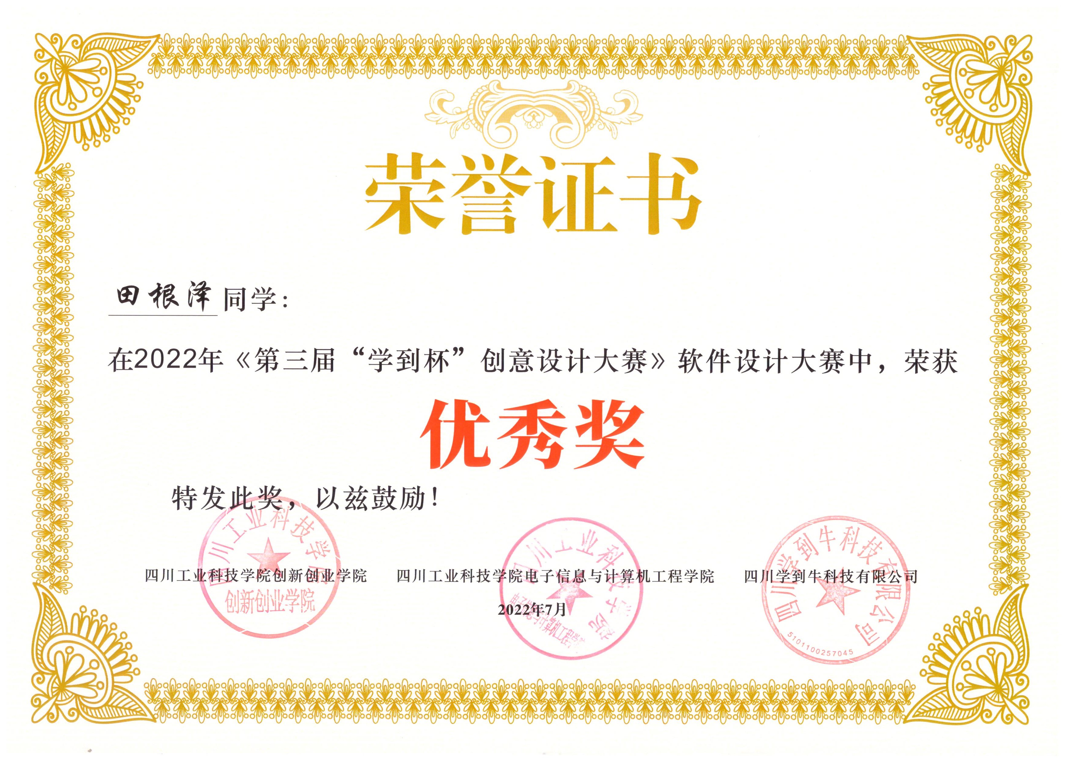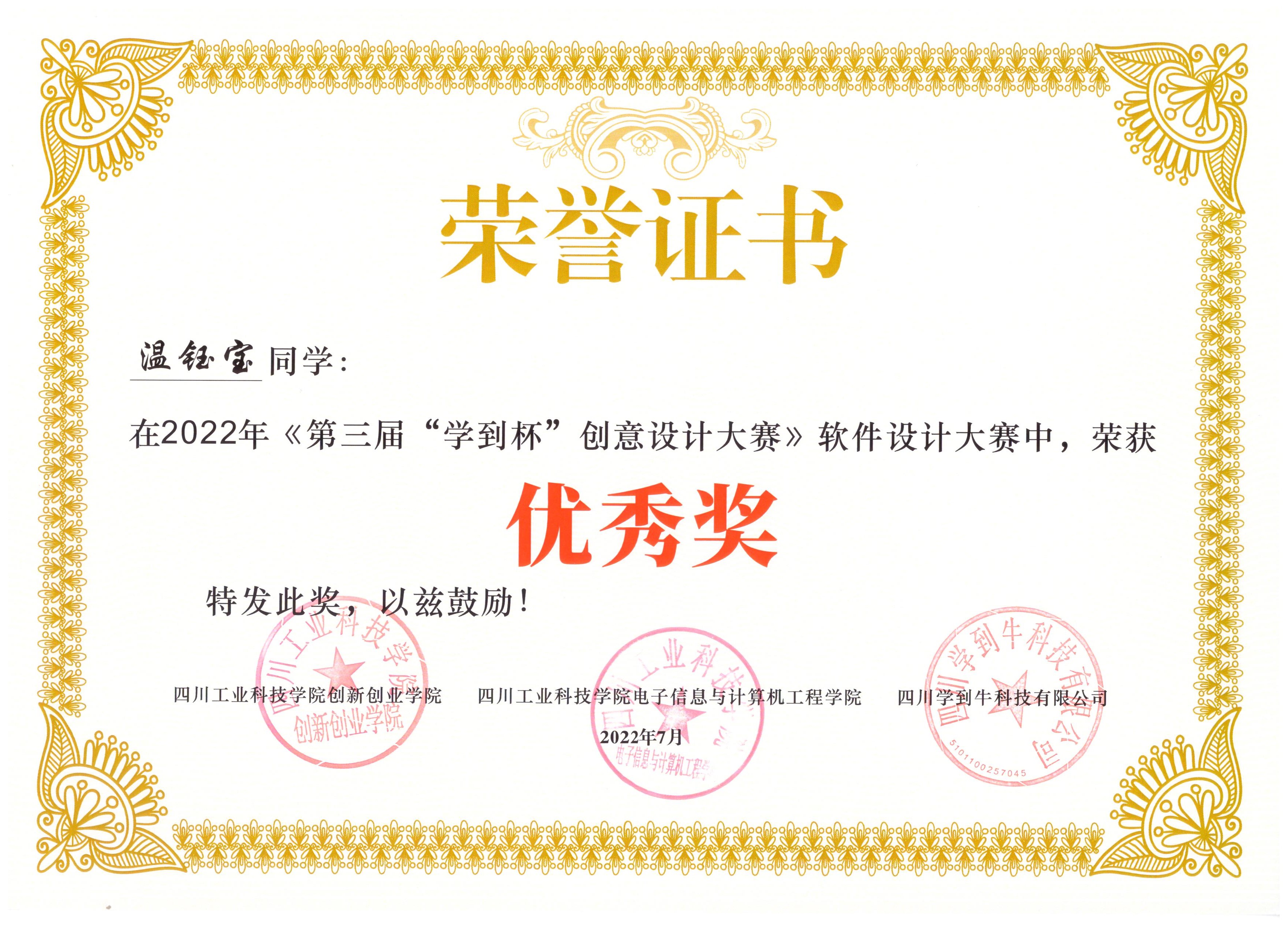 2022《第三届“学到杯”创意设计大赛》软件设计大赛奖状