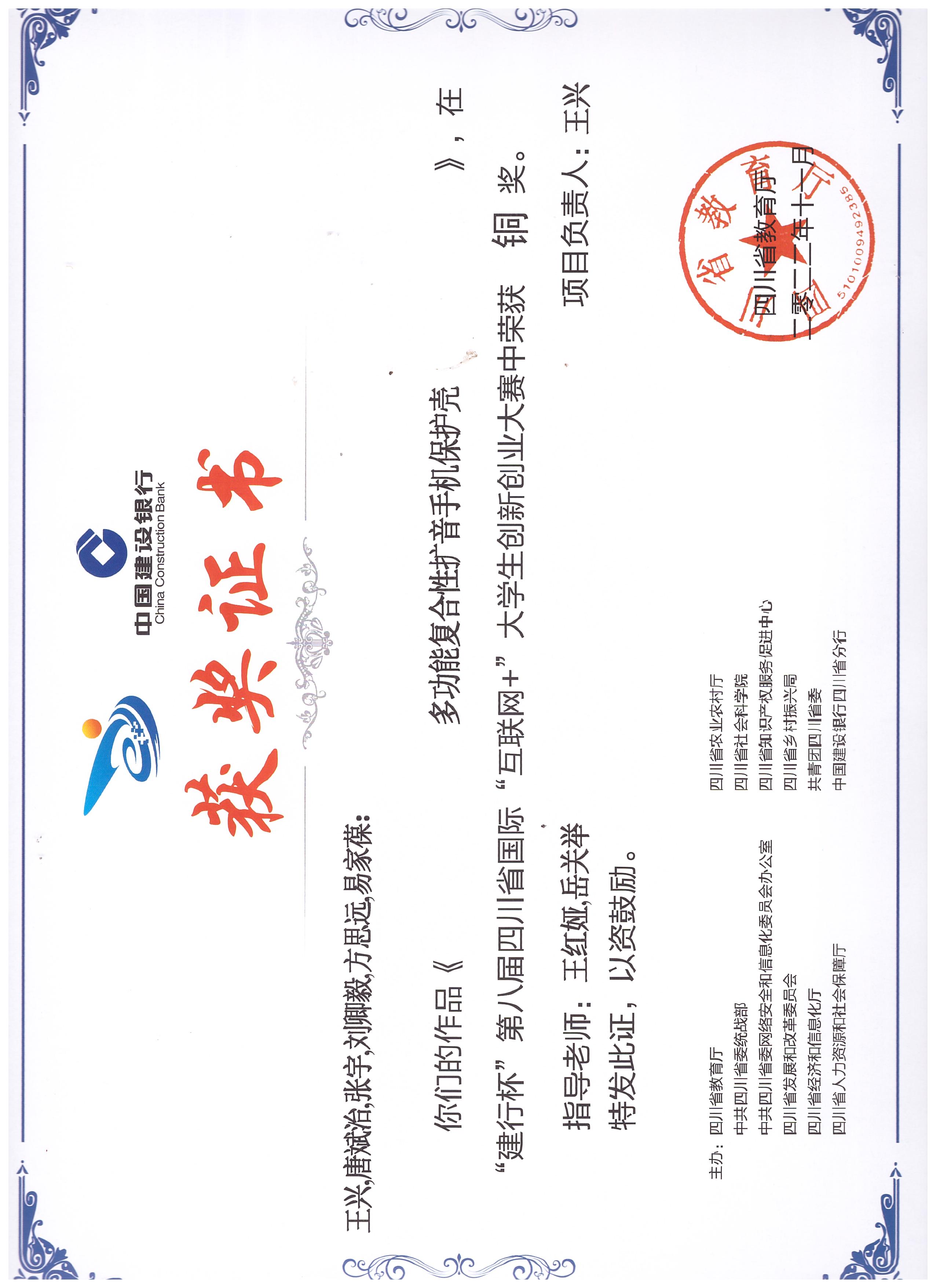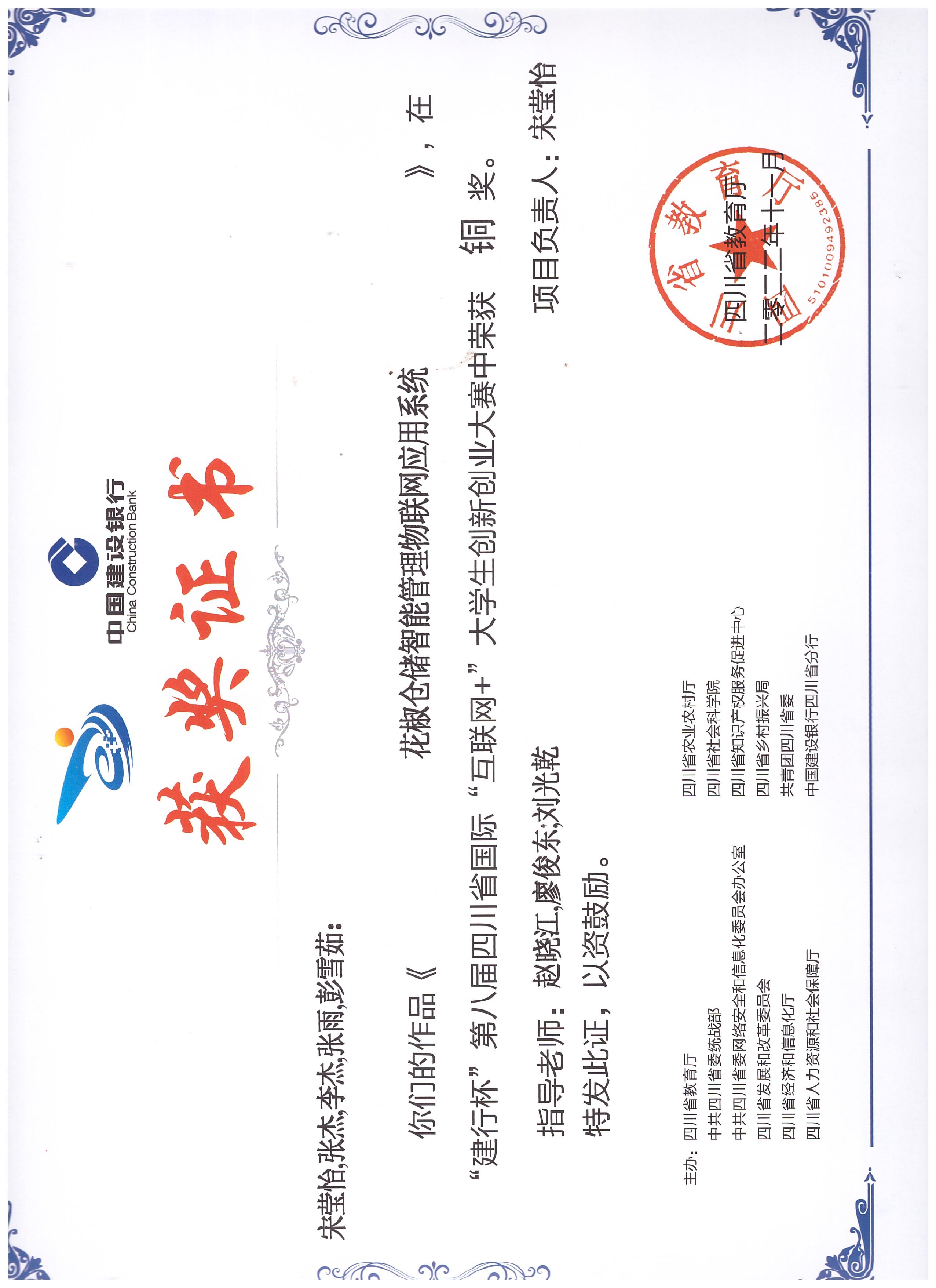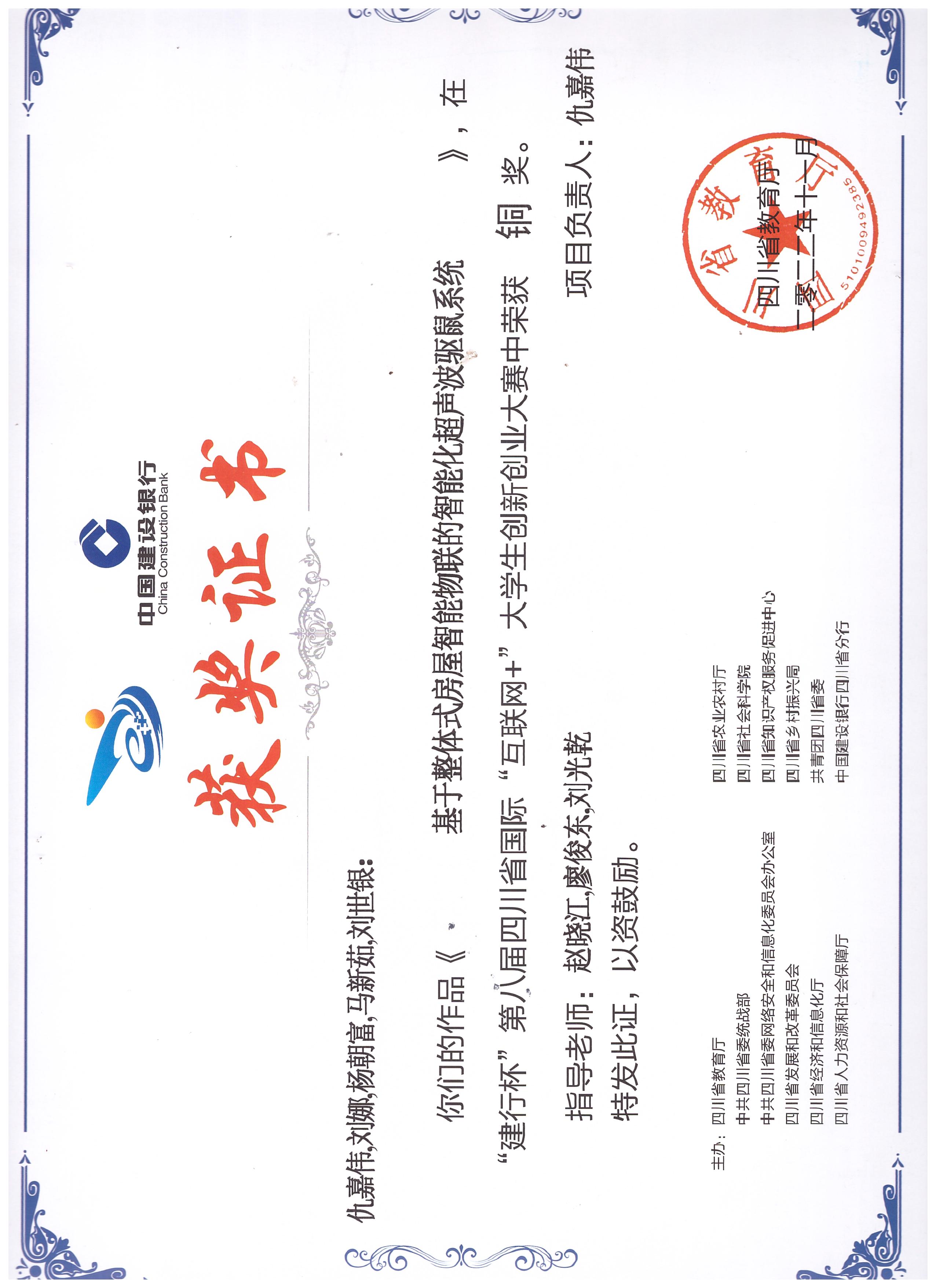 “建行杯”第八届四川省国际“互联网+”大学生创新创业大赛奖状
