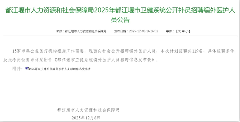 招聘119名!2025年都江堰市卫健系统公开补员招聘编外医护人员公告