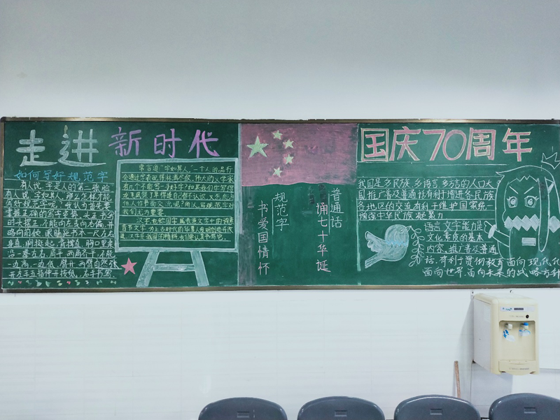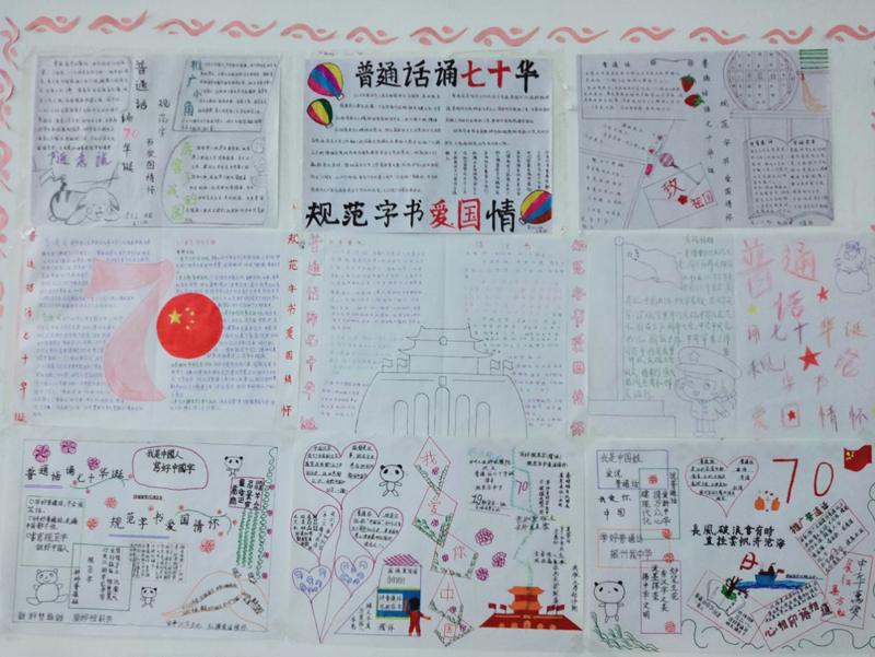 在活动中,各班级同学积极参与,各班分别以黑板报和手抄报的形式展现了他们对“普通话诵七十华诞,规范字书爱国情怀”活动的热情,表达了他们强烈的爱国情怀。