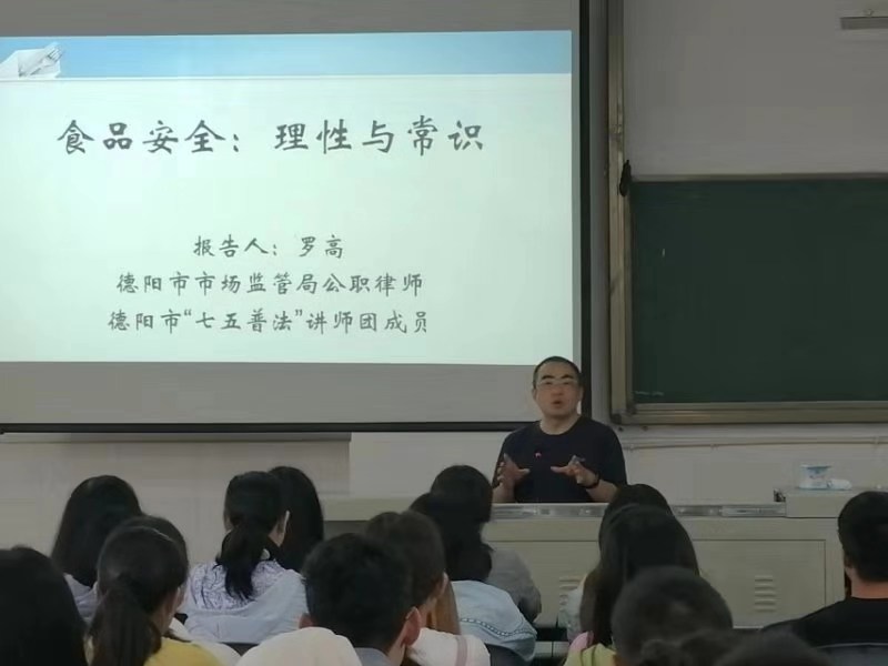 为丰富学生第二课堂、增强学生专业知识素养,9月11日,我院特邀德阳市市场监管局公职律师、“七五普法”讲师团成员罗高在7号楼201教室举行”食品安全:理性与常识”知识讲座,我院2018级部分学生参加了本次讲座。