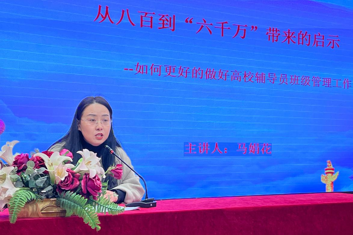 会上,马娟花书记以《从八百到“六千万”带来的启示》为题,从辅导员工作的“六千万”出发,结合自身工作经验和具体案例,就如何更好的做好高校辅导员工作展开详细精准的分析探讨。