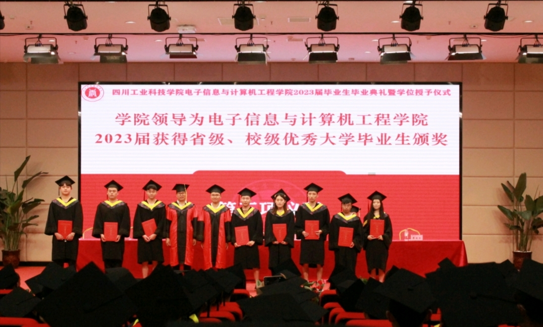 执行院长龙厚彦先后宣读我院2023届获得学士学位毕业生名单,省级、校级优秀大学毕业生名单,并温情寄语同学们前程似锦。计算机系主任陈会平、电子电气系主任廖俊东为省、校级优秀大学毕业生颁发奖状。