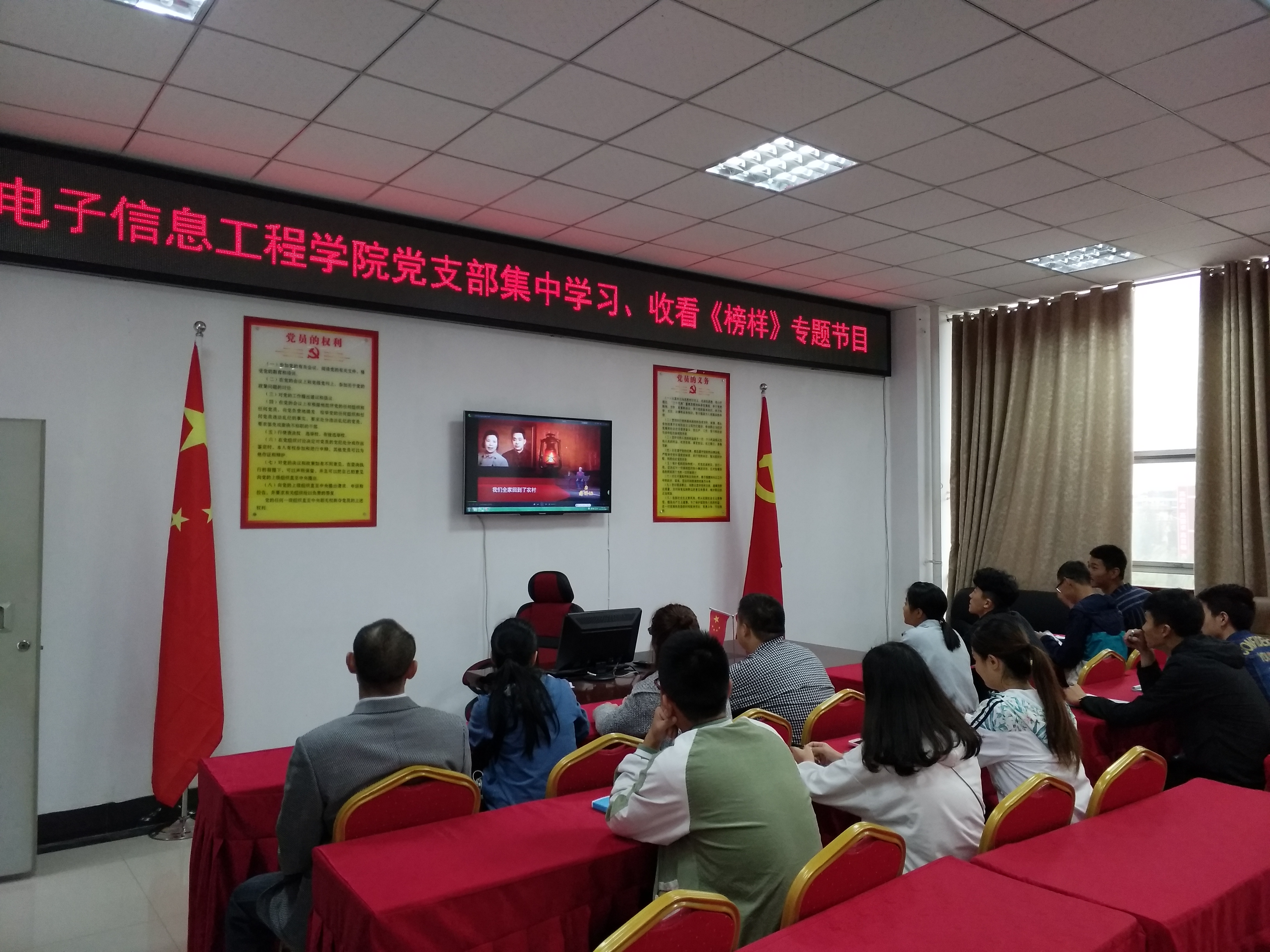 2017年10月9日,电子信息工程学院党支部组织党员、预备党员、入党积极分子在图书馆三楼党员活动中心集中学习收看《榜样》、《山谷中挺起不倒的脊梁》、《为灾区群众撑起一片天》专题节目。
