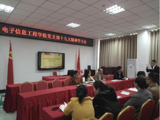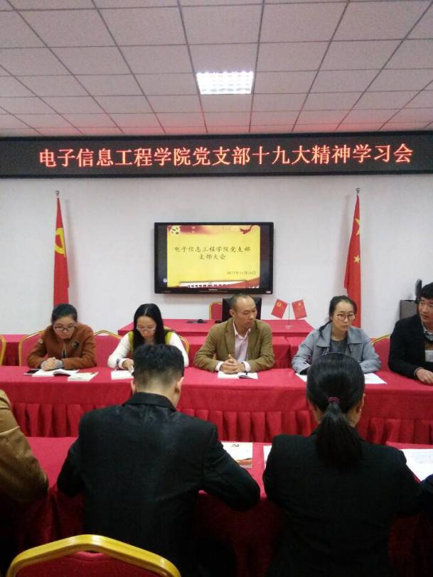 2017年11月10号,电子信息工程学院党支部组织召开党支部会议。本次会议主要内容是学习贯彻党的十九大精神,参观校史馆、重温学校发展历程,讨论发展第21批预备党员。会议由支部书记陈亨贵主持。