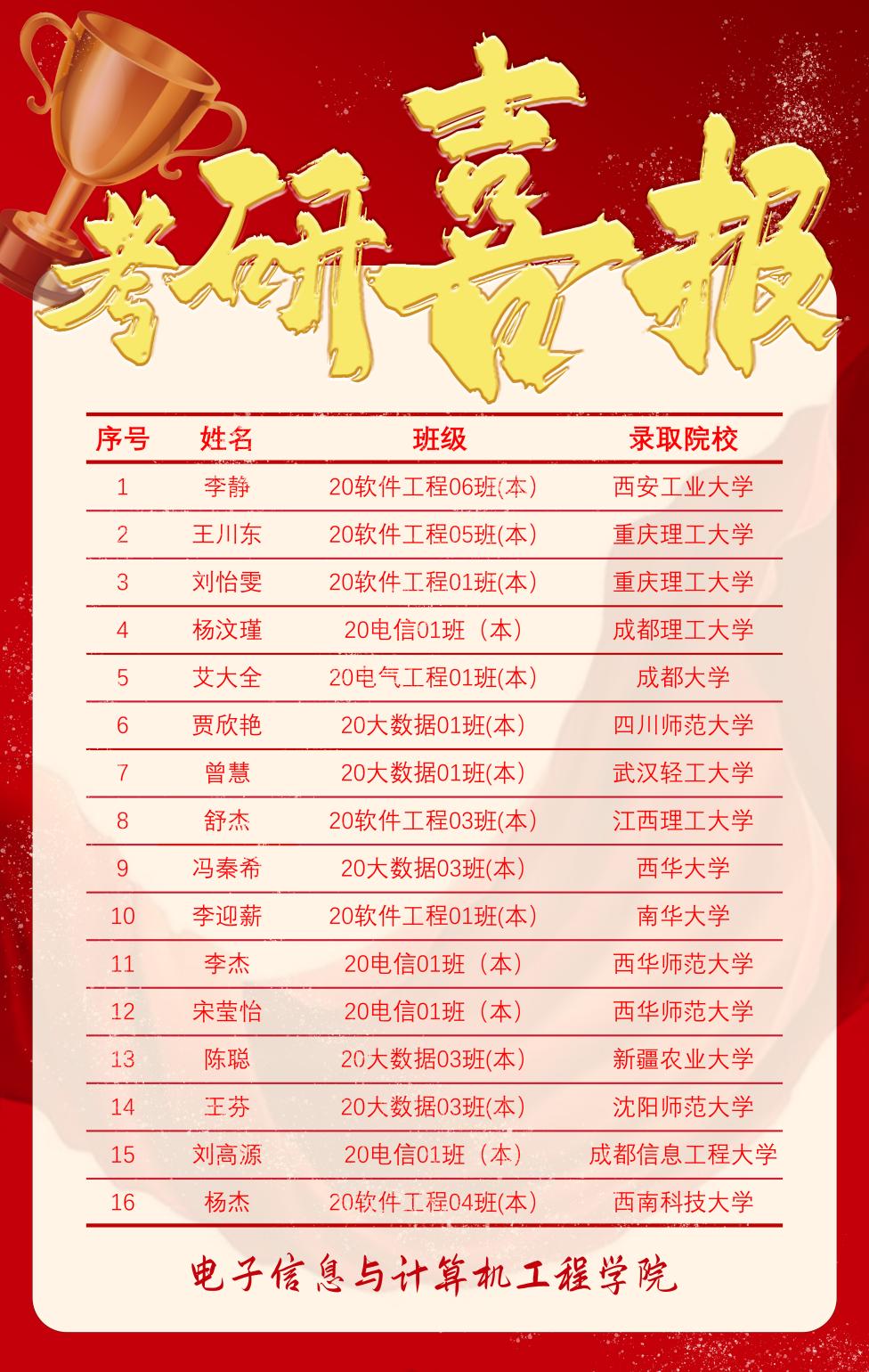 据统计,我院参加硕士研究生招生考试学生中,25人过线,已有16人成功上岸。李静、王川东等同学分别被西安工业大学、重庆理工大学等高校录取。