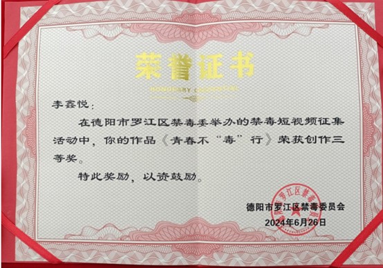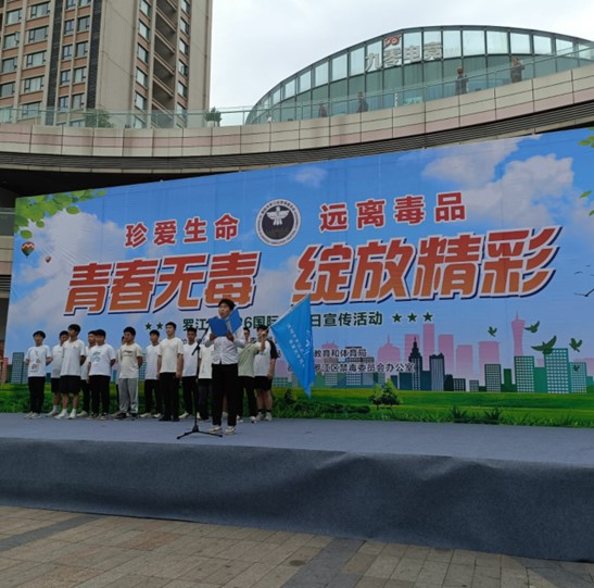 活动中,区人大常委会副主任、区禁毒委副主任莫畏强宣读了“罗江区禁毒短视频征集活动”获奖作品名单。我院学生李鑫悦的作品《青春不“毒”行》荣获创作三等奖。西南财经大学天府学院学生代表将“大学生志愿者禁毒宣传服务队”队旗交至四川工业科技学院学生代表龙春权手上。龙春权同学发言表示,接过队旗就意味着责任,四川工业科技学院禁毒志愿者将继续加强禁毒宣传,把毒品预防知识宣传到每一名同学,进一步提高同学们的识毒、防毒、拒毒、反毒意识。