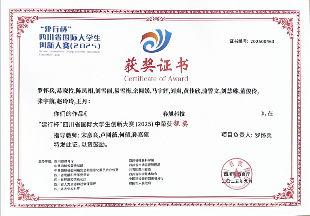 近日,由四川省教育厅、中共四川省委宣传部等十余家单位联合主办的“建行杯”四川省国际大学生创新大赛(2025)获奖名单揭晓。学校计算机工程学院学生团队凭借作品《春旭科技》荣获大赛银奖,展现了学院在创新创业教育和应用型人才培养方面的扎实成效。