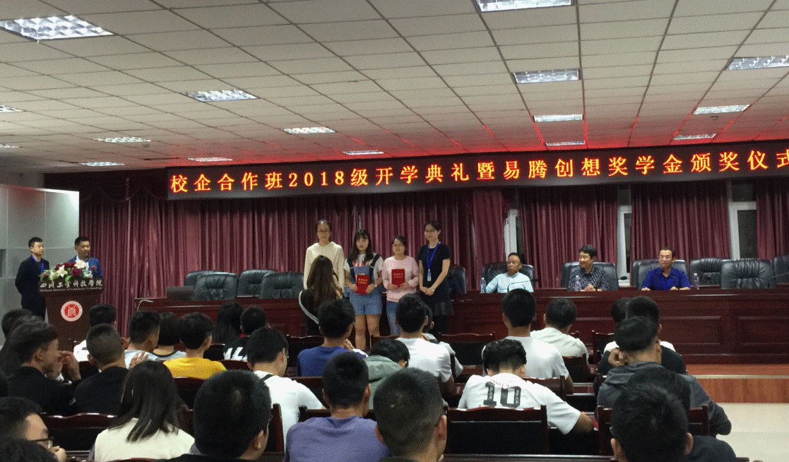 易腾创想智能科技有限公司总经理易伟春就大学生职业规划作讲解,鼓励同学们要克服学习困难,认真学习专业技能,成为合格的专业人才。企业副总经理施俞行解读了“易腾创想”校企合作班的宗旨,就企业如何帮助学生学习和就业做了详细说明并宣读“易腾创想”奖学金评选制度和奖学金获得名单,与会领导分别为获奖学生颁发证书和奖金。
