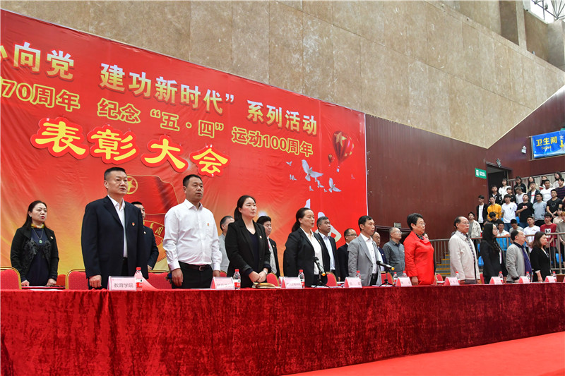 表彰大会之后,学校青马班学员、团员代表和我校入选中国好声音12强的学员一起为纪念“五四”运动100周年表彰大会献礼,为现场师生带来了诗朗诵《青春中国》和歌曲《我的太阳》等精彩节目,他们铿锵有力的朗诵和深情嘹亮的歌声,充分表达了广大青年对祖国的无比热爱和一心向党的衷肠。