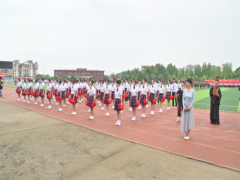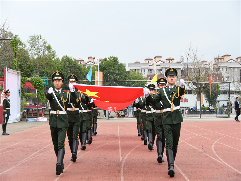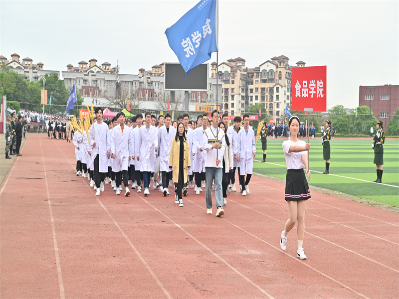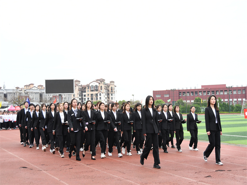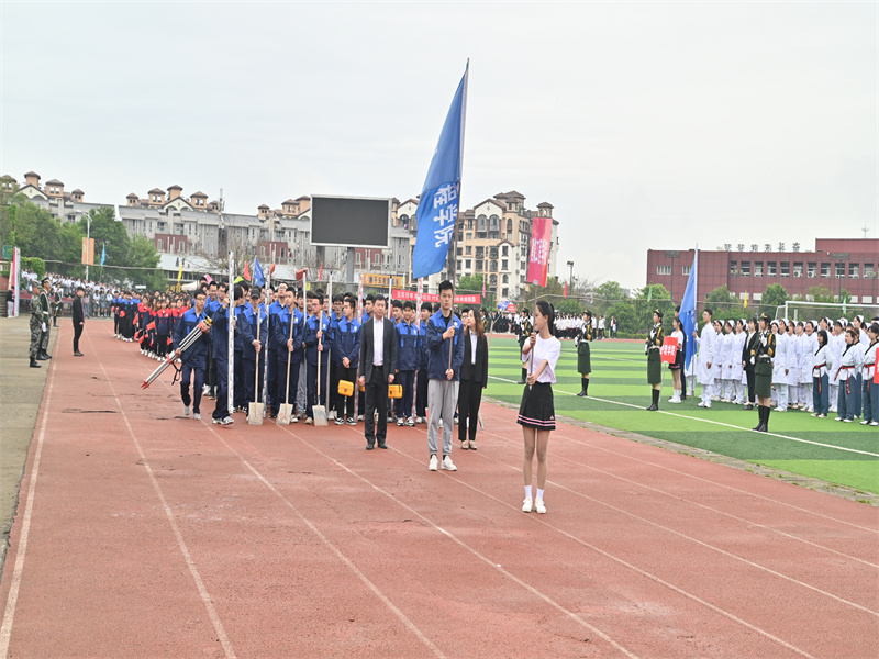 伴随激昂的《运动员进行曲》,学校女子国旗护卫队、彩旗、裁判员、各二级学院代表方队依次昂扬走过主席台。