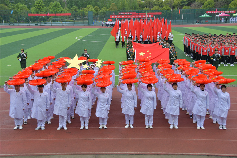 护理学院的学子们手拿拉花,在主席台前拼出五星红旗,用这种特别的方式表达对祖国的热爱;