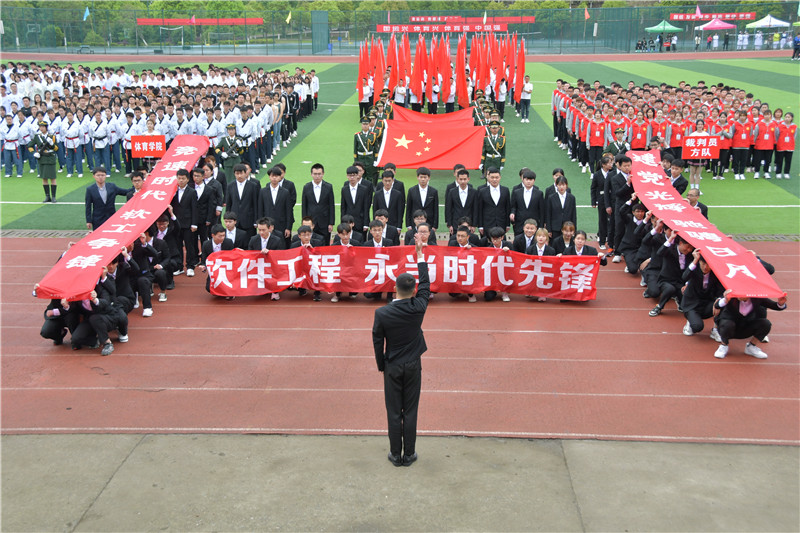 电子信息与计算机工程学院学子们变换着方阵队列述说着对党和祖国的热爱;
