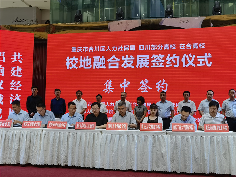6月11日上午,重庆市合川区人力资源和社会保障局与高校校地融合发展签约仪式在绿港财富广场举行。合川区人力资源与保障局党委书记、局长柳萍,在合高校签约代表、四川工业科技学院校长张小南、校长助理张清军出席签约仪式。合川区委常委、组织部部长何川、区人力社保局班子成员、各高校负责人共同见证了签约仪式。