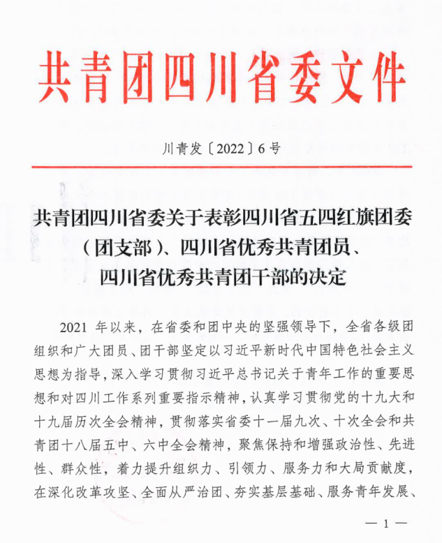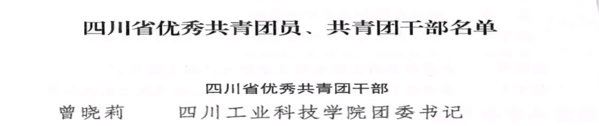近日,共青团四川省委下发了《关于表彰第25届四川省五四红旗团委(团支部)、四川省优秀共青团员、四川省优秀共青团干部的决定》,学校团委书记曾晓莉荣获“四川省优秀共青团干部”荣誉称号。