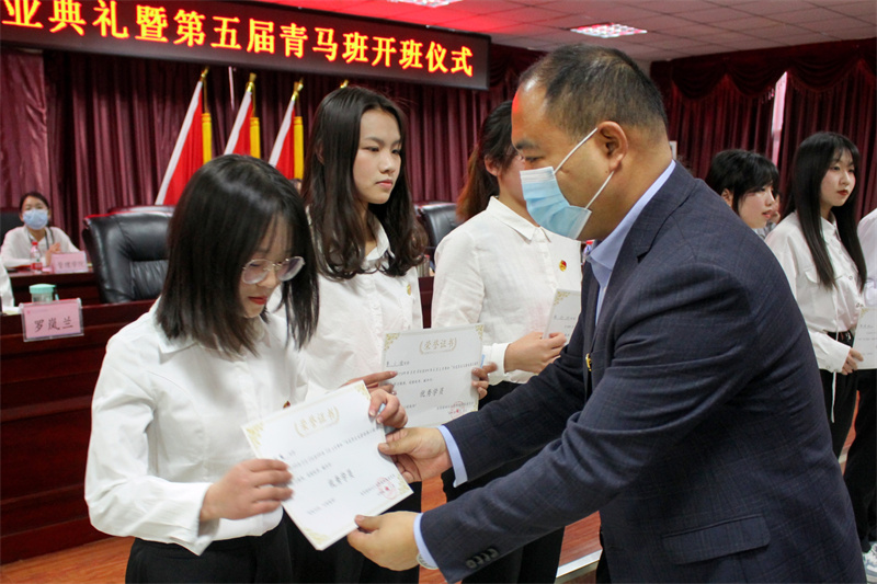 为深入学习贯彻习近平新时代中国特色社会主义思想,持续深入推进青年马克思主义者培养工程,学校于4月21日在图书馆D-08举办第四届青马班结业典礼暨第五届青马班开班仪式。学校党委书记张继华,党委副书记、纪委书记倪霞,党委副书记杨朋,党委组织部部长卢尚东,党委宣传部副部长罗岚兰,学生处副处长何林贵,学生处副处长蒋亮,学生处副处长蔡明,团委副书记何彬,以及各二级学院团总支书记出席仪式,第四届青马班优秀学员与第五届青马班全体学员参加仪式,学工部副部长、团委书记曾晓莉主持开班仪式。