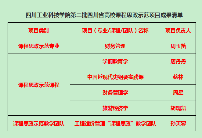 4月28日,四川省教育厅发布了《四川省教育厅关于公布第三批高等学校省级课程思政示范项目认定结果的通知》,学校获评课程思政示范专业1个,课程思政示范课4门,课程思政示范教学团队1个。
