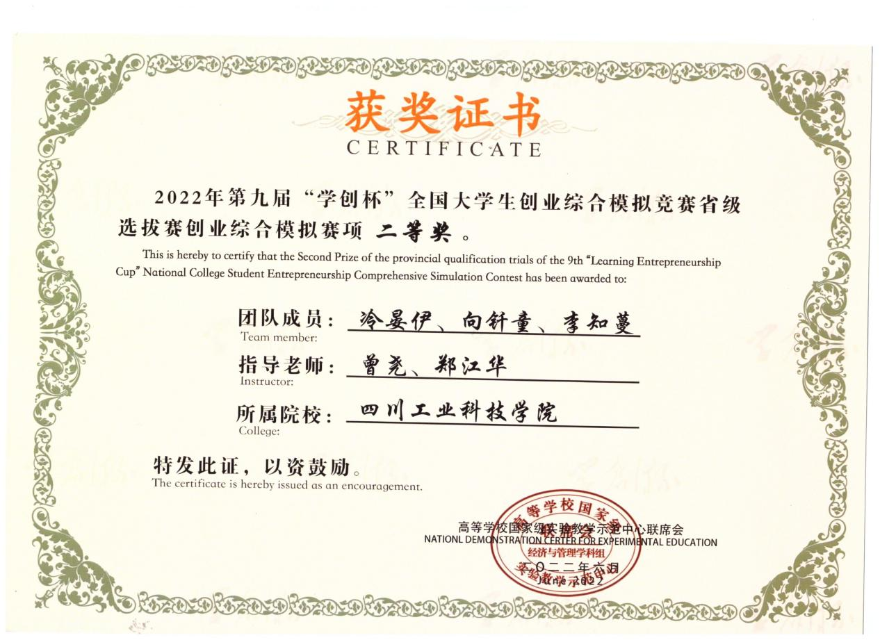 近日,第九届“学创杯”全国大学生创业综合模拟大赛四川省选拔比赛结果出炉。学校曾尧、郑江华以及王进、黄双老师联合指导的两支队伍分别获得等奖和等奖,并均荣获“优秀指导教师”称号