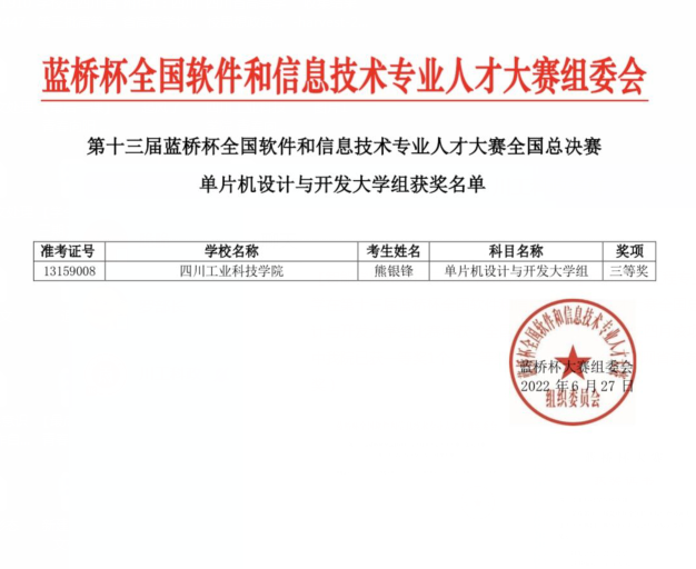 日前,蓝桥杯全国软件和信息技术专业人才大赛组委会公布了“第十三届蓝桥杯全国软件和信息技术专业人才大赛全国总决赛”获奖名单,学校智能制造与车辆工程学院学子熊银锋斩获单片机设计与开发大学组三等奖。