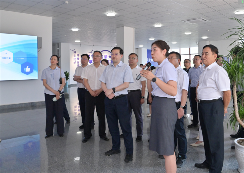 刘晓博一行实地考察了学校大学生创业智慧服务空间和智能制造与车辆工程学院实训中心,了解了学校的办学历程、学科专业设置等,听取了学校就业创业工作、大学生创业智慧服务空间建设和使用情况介绍。