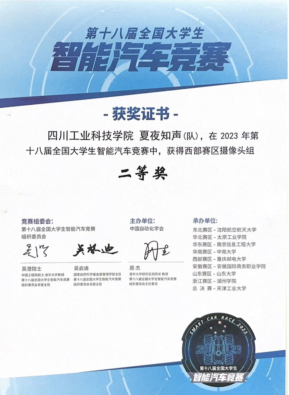 其中,三轮摄像头组“夏夜知声队”在预赛66支队伍中排名第九,挺进决赛,在决赛中击败了西北工业大学,西南交通大学,火箭军工程大学,长安大学,西华大学等知名院校,最终获得第十五名的好成绩;极速越野组“狂飙小分队”在省赛中获得三轮摄像头组三等奖,在不到一个月的西部赛备赛期内,转战极速越野组,最终获得该赛道西部赛二等奖。