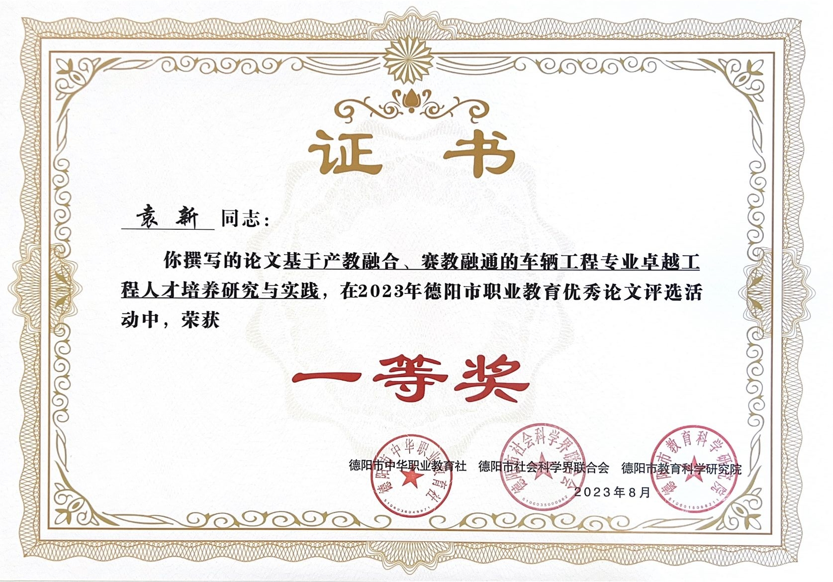 近日,由德阳市中华职业教育社、德阳市社会科学界联合会、德阳市教育科学研究院共同举办的2023年德阳市职业教育优秀论文评选结果揭晓。智能制造与车辆工程学院副院长袁新副教授撰写的论文《基于产教融合、赛教融通的车辆工程专业卓越工程人才培养研究与实践》获得一等奖。