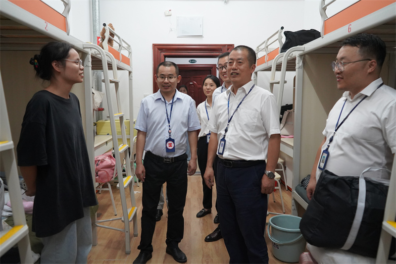 在学生公寓,校领导对同学们的到来表示热烈的欢迎,并同新生进行了亲切的交流,询问新生对于校园生活的适应情况,耐心解答学生们对于校园生活的关切,鼓励同学们尽快转变角色,适应新的学习生活环境,在学校度过充实的大学生活。
